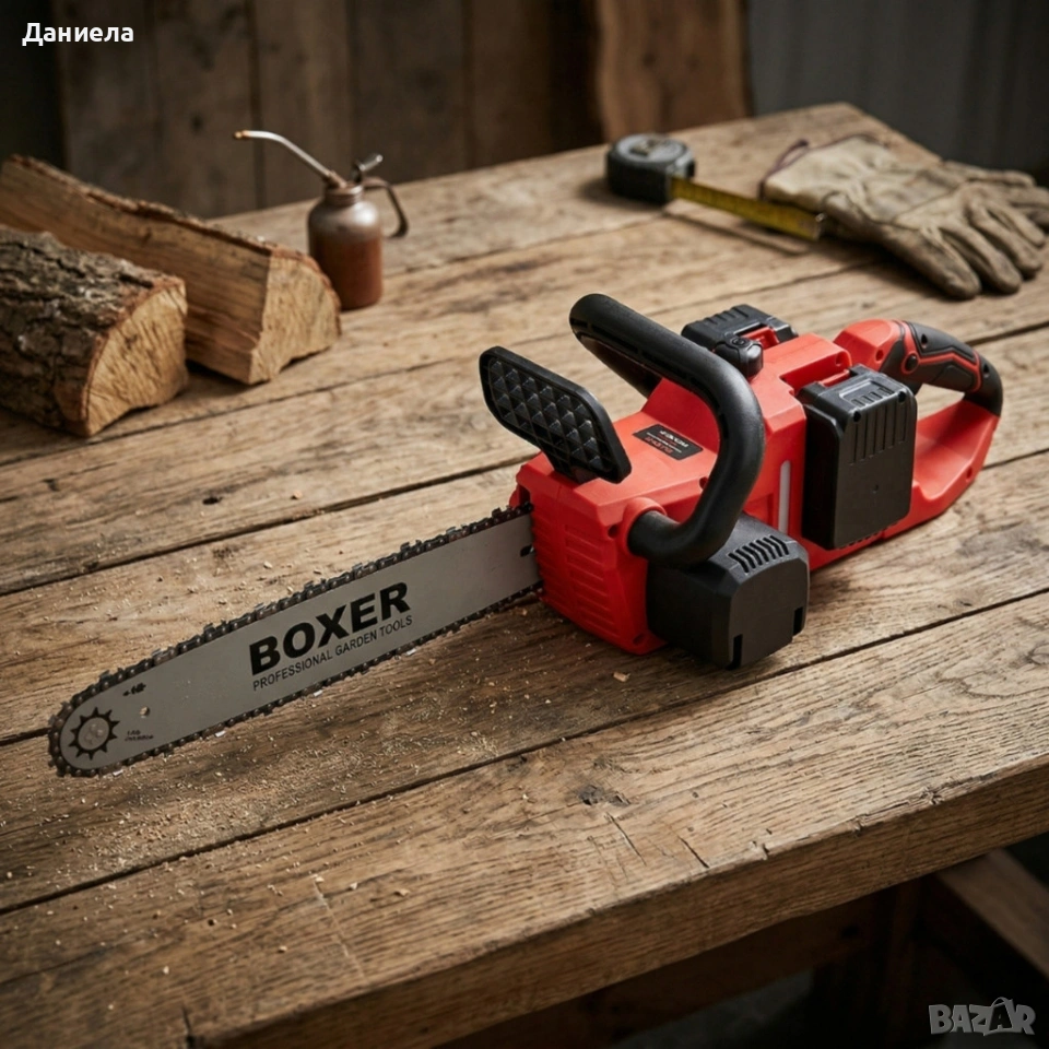 Технически характеристики на Акумулаторен верижен трион BOXER BX-3316 48V – 2 батерии + куфар, мощен и удобен Мощност: 1850 W Батерии: 2 x 48 V, 6 Ah литиево-йонни Дължина на шина: 40 см (16'') Скорост на веригата: 15 м/с Обороти: 4100 об/мин Система за смазване: автоматична Тегло: само 5 кг Допълнителни предимства: автоматичен обтегач на веригата, тих ход, минимални вибрации