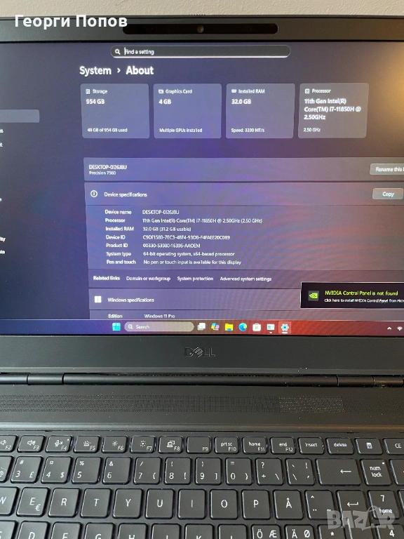 Процесор: Intel Core i7-11850H - 8 ядра / 16 нишки, до 4.8GHz Turbo Boost