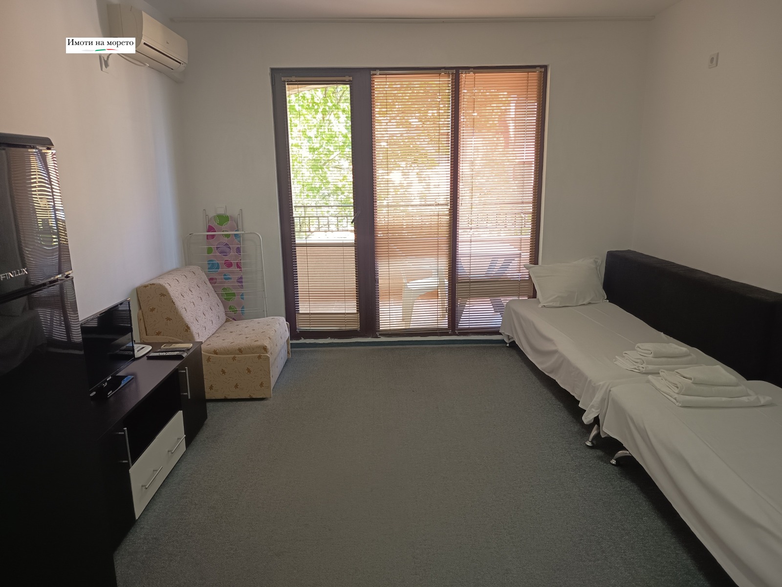 Обзаведено студио с изглед към градината в затворен комплекс 4* на брега на морето, Ахелой. Тип на имота: обзаведено студио в много добро състояние с изглед към зелени площи Разпределение: коридор, дневна с кухненски кът, баня с тоалетна, балкон Квадратура: 48 кв.м с общите части Локация и удобства: комплексът е разположен на брега на морето, на тихо място, точно на плажа Разстояние до плажа: 10 метра Възможност за паркиране: в комплекса, на улицата Разрешение за ползване: да Годишна такса поддръжка: 12 евро/м2/година Комплексът предлага следните удобства: рецепция, басейни, включително детски басейн, ресторанти с българска / европейска кухня, магазин за хранителни стоки и магазин за плажни аксесоари, модерен фитнес център на закрито, сауни, СПА център, детски клуб, стаи за масаж, медицински център / медицинско обслужване в сезона, детски и спортни площадки, безплатен неохраняем и безплатен охраняем паркинг, индивидуални екскурзии, коли под наем, мини футбол, билярд и тенис на маса.