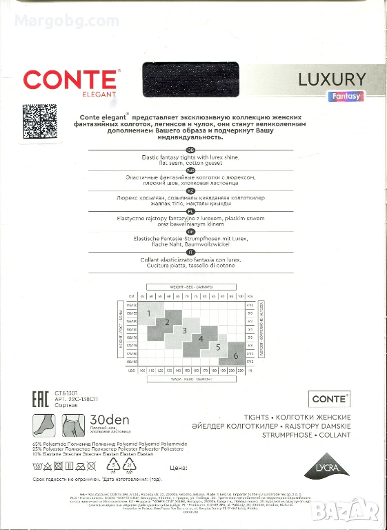 Чорапогащник фигурален Conte Luxory Fashion 30 den е стилен чорап със сребрист ефект. Стилно оформяща се линия на тялото.