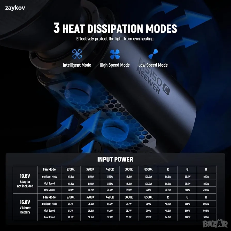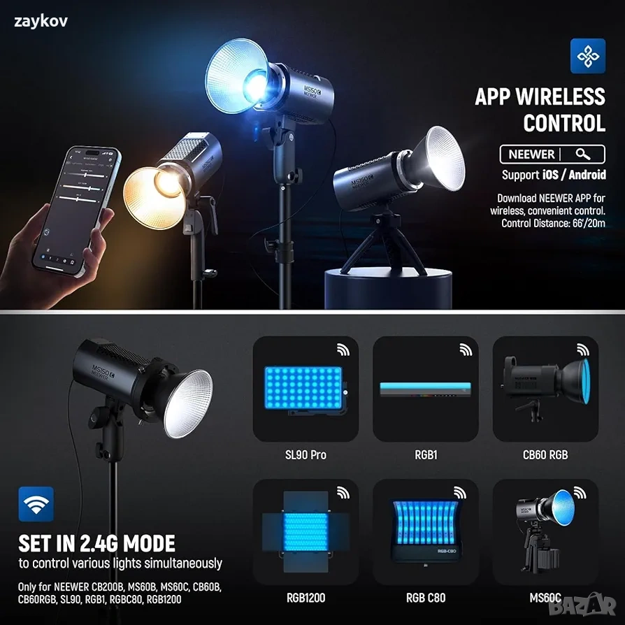 【Приложение Infinity и 2.4G безжично управление】Има 3 режима на управление: 1. С физическо управление. 2. С приложение NEEWER и технология Infinity за управление на стотици светлини и актуализиране на OTA фърмуер. 3. С 2.4G система за групово управление на LED светлини от различни модели на канали 00-99 в радиус от 15 м. Когато е настроено на един и същ канал, настройката на една светлина може да промени едновременно и останалите.
