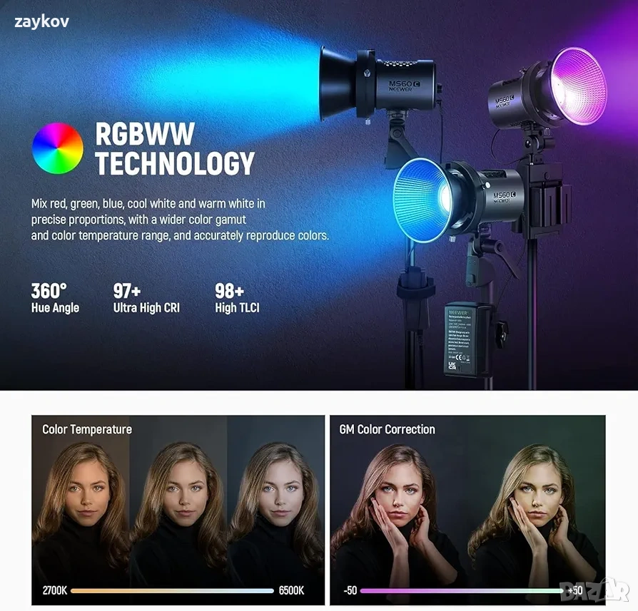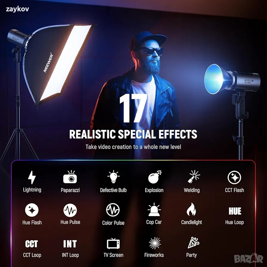 【4 режима на осветление с реалистични специални ефекти】Има 4 режима на осветление: CCT режим с цветна температура 2700K-6500K и GM -50/+50 корекция за оптимална цветна температура, HSI режим с 360° ъгли на нюанса и насищане 0-100% за всички RGB цветове, RGBCW режим с отделна настройка на червено, зелено, синьо, студено бяло и топло бяло за смесване на цветове и FX Scene Mode, който предлага 17 сцени със специални ефекти за креативни видеоклипове.