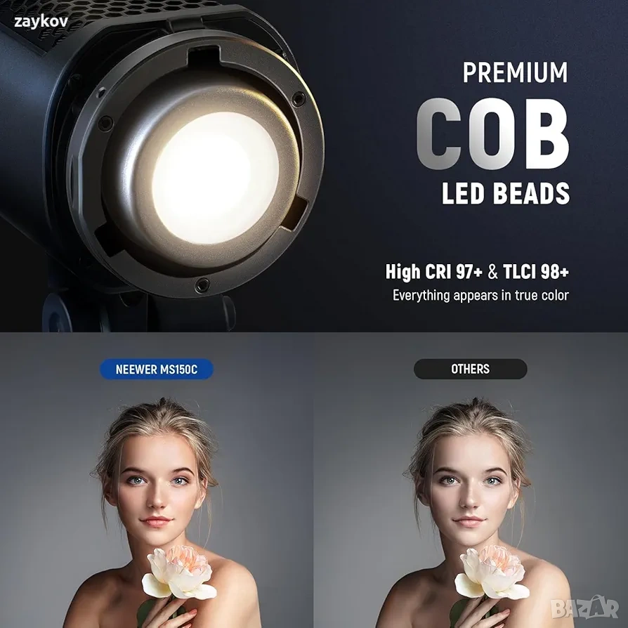 Усъвършенствано RGBWW смесване на светлина и прецизно PWM затъмняване】MS150C използва RGBWW технология за смесване на светлина. Разполага с двуцветно осветление 2700K-6500K, изходна мощност 150W и осветеност 18000lux/1m (4400K). Високо цветопредаване CRI97+/TLCI98+, осветление без трептене 1/2000s. Линейната PWM технология за затъмняване NEEWER предлага минимален лимит на яркостта от 1% леко ярко (яркостта и мощността са на 1%) до 100% ултра ярко.