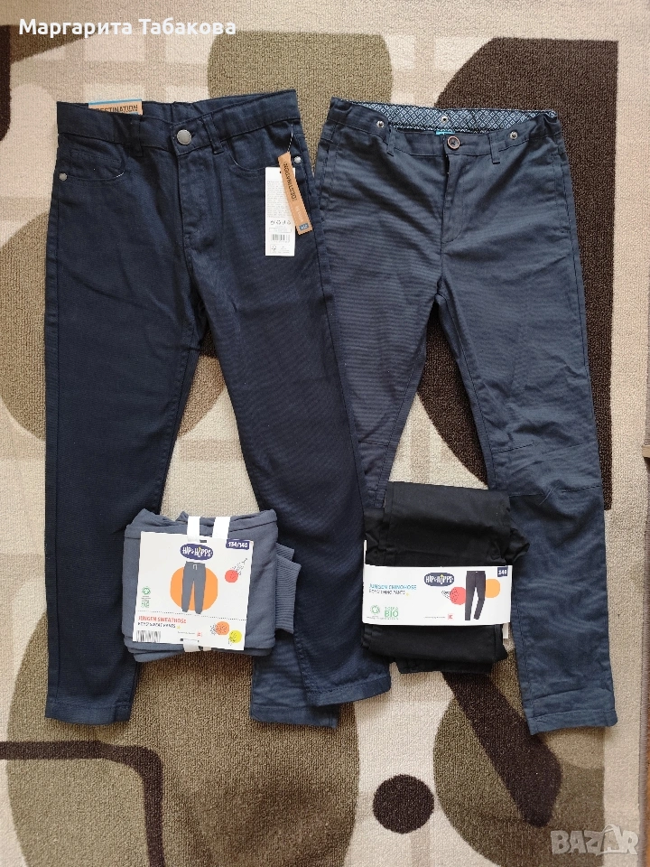 Лот от 4 броя панталони за момче размер 134-140 см, 3 от тях са нови, само десният е обличан веднъж за повод. Цена на лота 16€, изпращам с Еконт