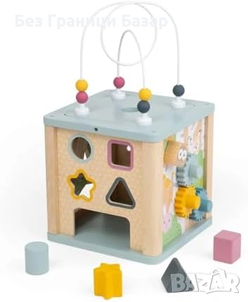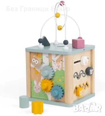 Дървен активити куб с 5 занимателни елемента