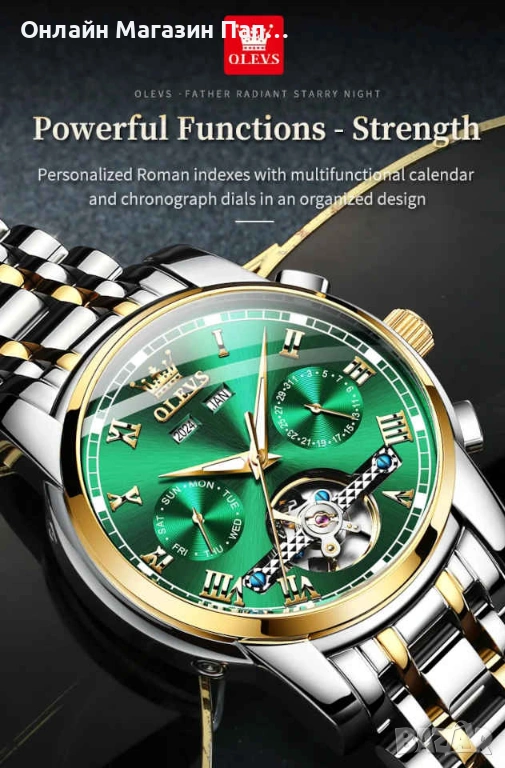 функционалността. Елегантният циферблат е с римски цифри, светещи стрелки и сложна многокомпонентна структура.