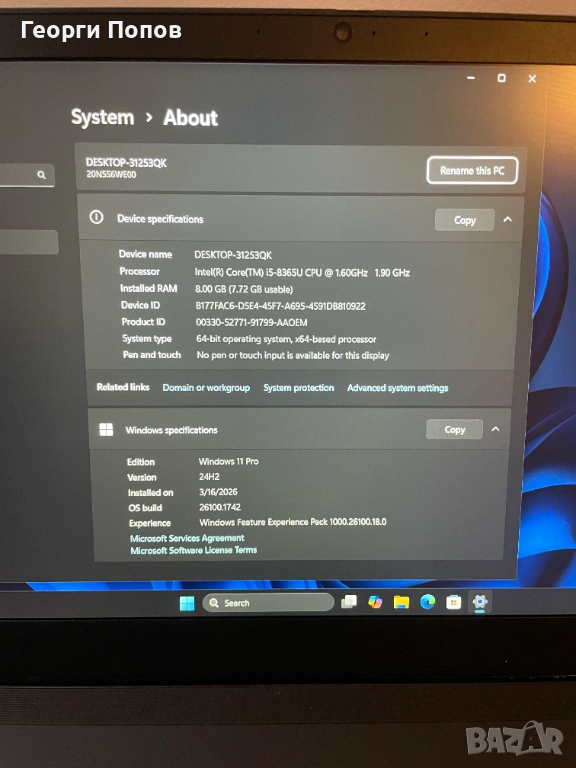 Лаптопът е в страхотно визуално състояние и технически изряден. Преинсталиран с оригинален и лицензиран Windows 11 PRO, готов за работа.