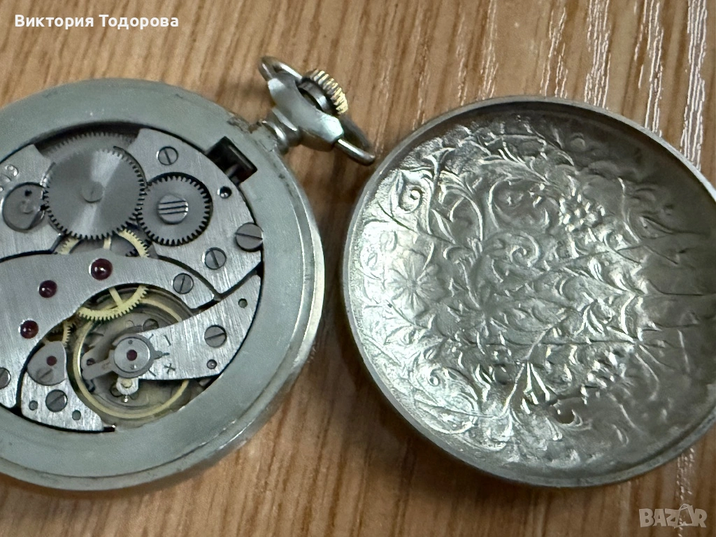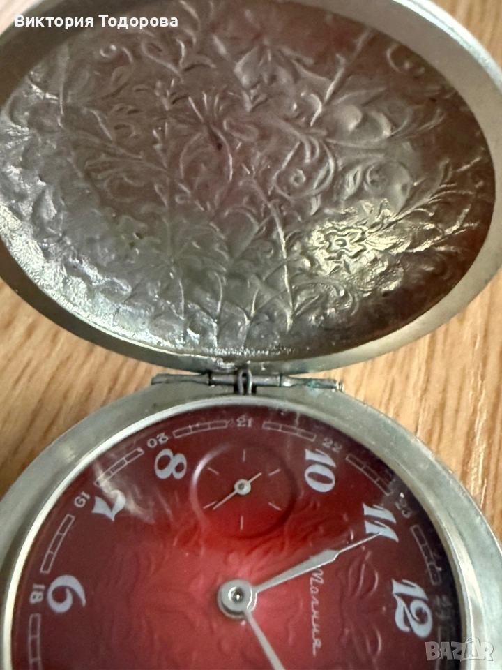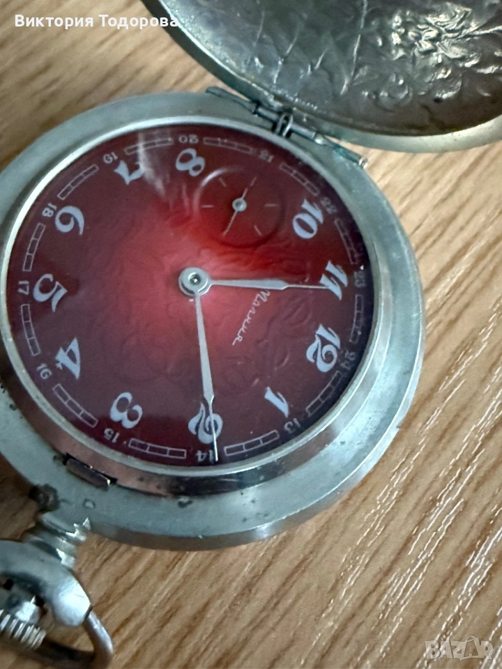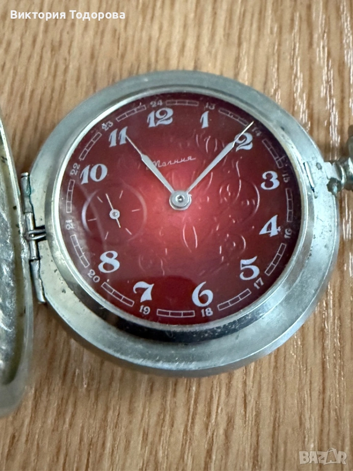 Здравейте! Предлагам джобен часовник Молния произведен в СССР. Настоящият екземпляр е с рядък Бордо циферблат и рядък корпус. Работи коректно.