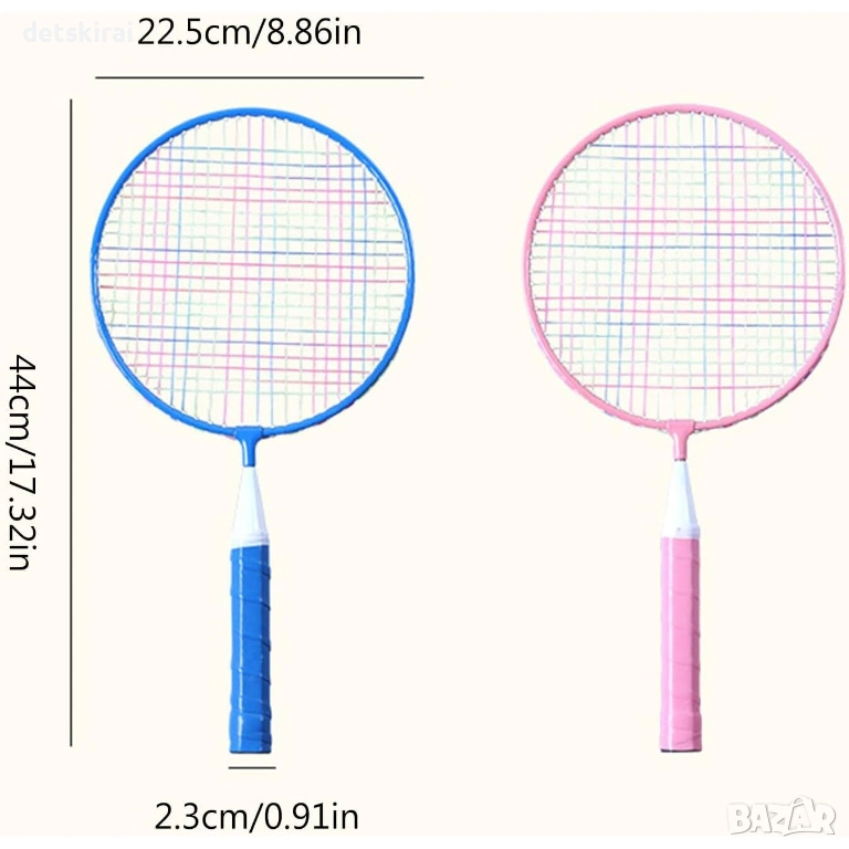 Ракетите са с размери 44 см дължина и 23 см ширина, което ги прави идеални за детски ръце. Късите дръжки осигуряват по-добър контрол и по-лесно управление, особено за начинаещи. Изработени са от здрава сплав, с качествена корда и найлонова дръжка, която е гладка, удобна и не наранява дланите.