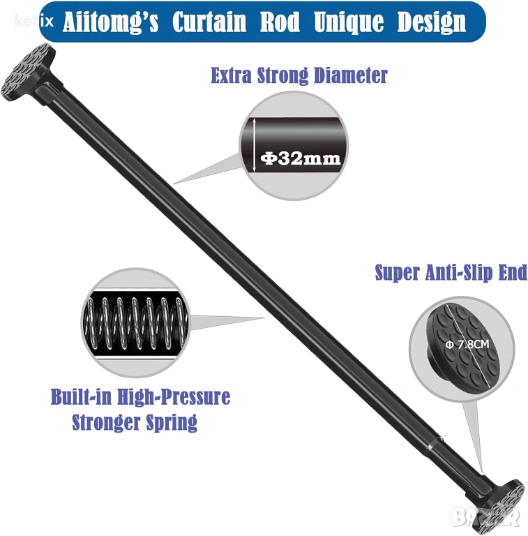 Разтегателният корниз за завеси е проектиран да се разтяга до 300 см, а дебелината от 1 мм ви позволява да го използвате за безопасно окачване на тежки тъкани – Преди покупка, моля, уверете се, че диаметърът на халките за завеси е по-голям от 38 мм. Ако е по-малък от 38 мм, може да не е подходящ.