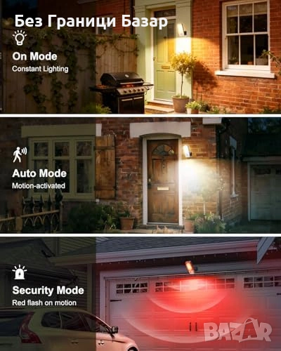 3 режима на работа – AUTO, ON и SECURITY с мигаща червена светлина