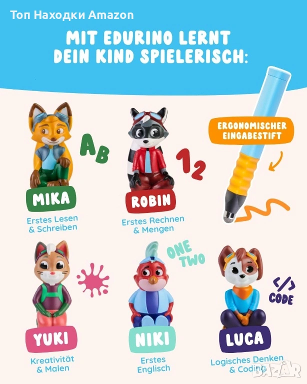 Пълен комплект за обучение: Включва всичките 5 фигурки на Едурино и ергономичен стилус.