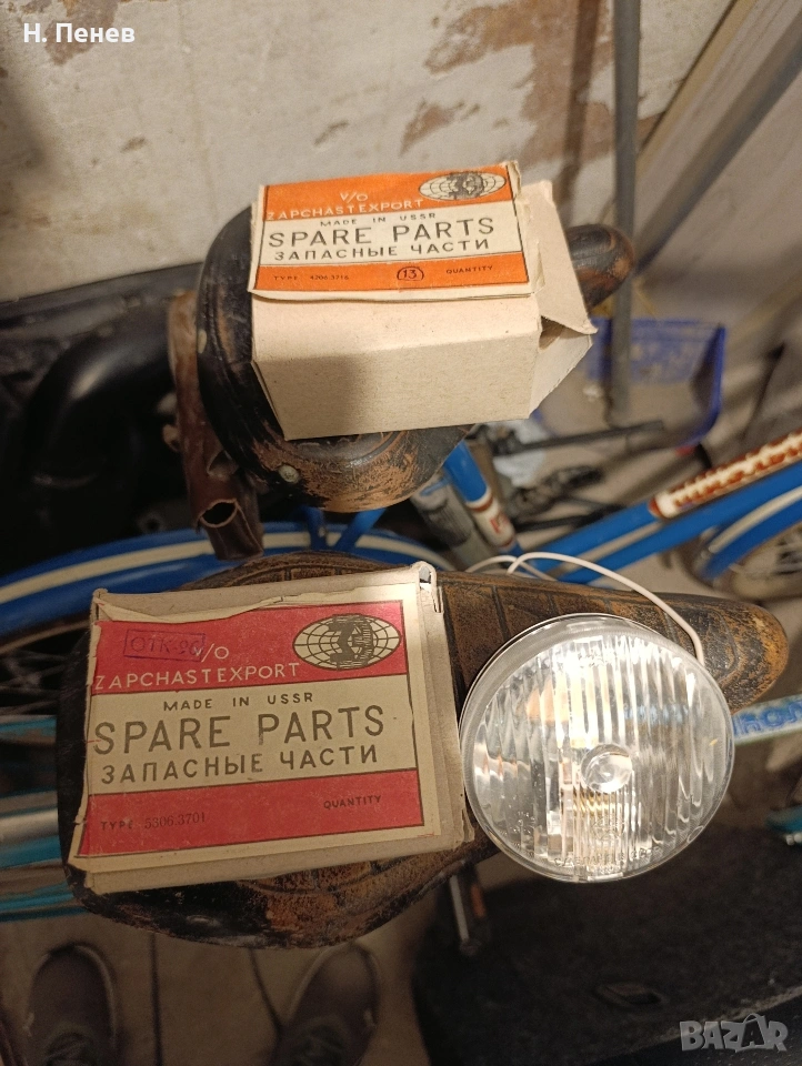 Комплект от фар, стоп и динамо, подходящ за ретро велосипед. Частите са нови, в оригиналните си опаковки, производство СССР. Цена 10€. Намират се в гр. Варна. Работя с Еконт. 0893044900