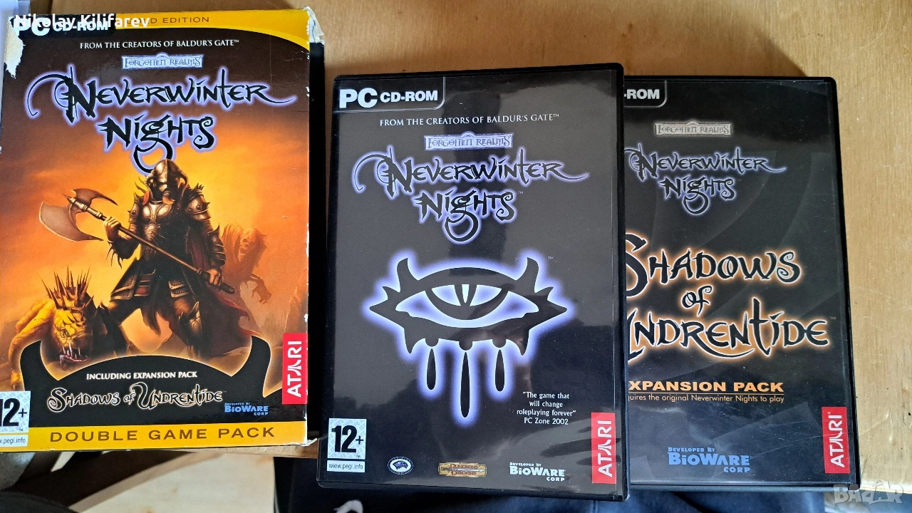Neverwinter Nights + Shadows of Undrentide (Голяма кутия) – Кутията има забележими ожулвания по ъглите, но като цяло е здрава. Дисковете са в отлично състояние. €8