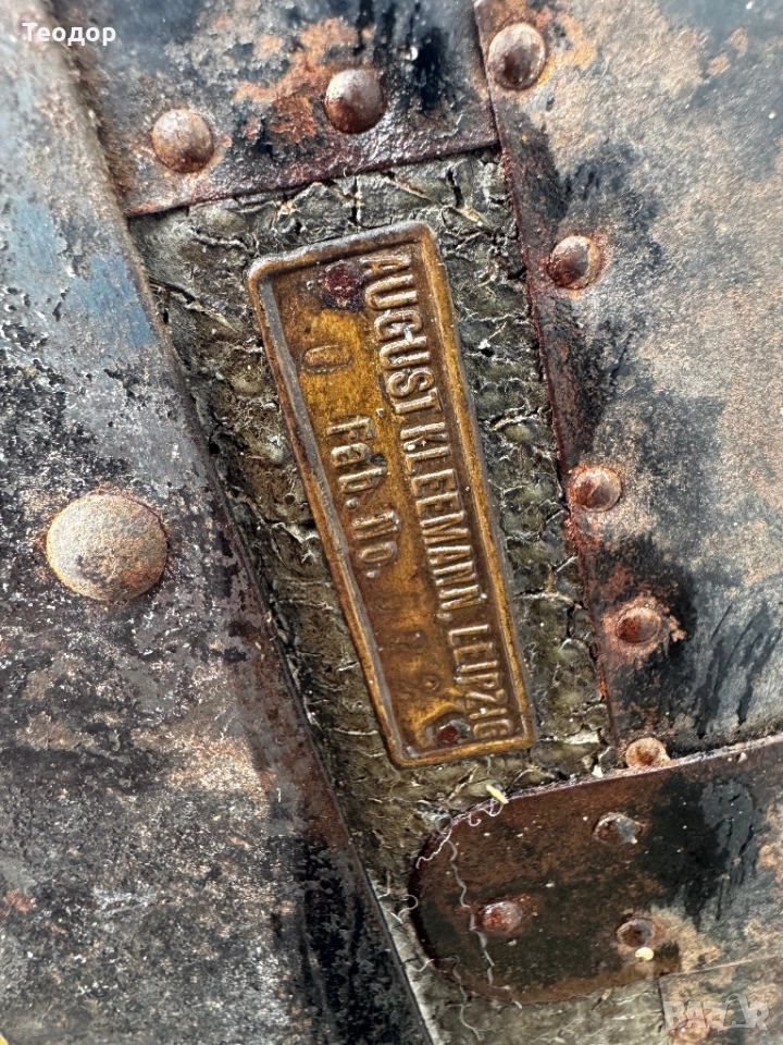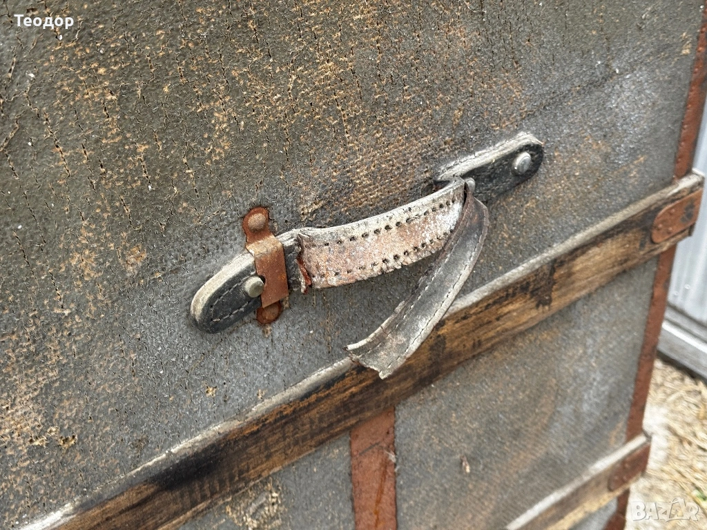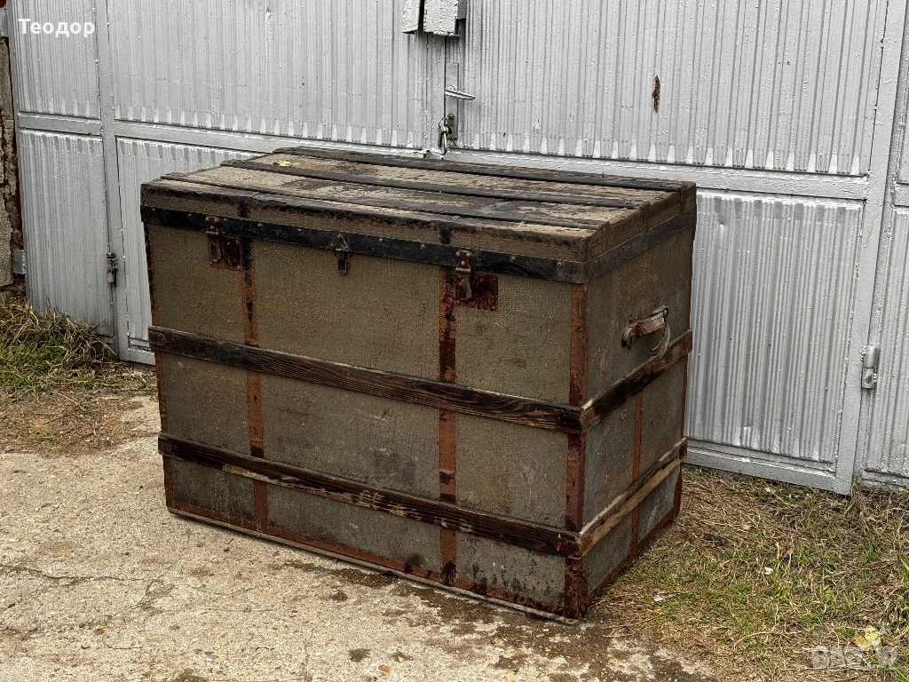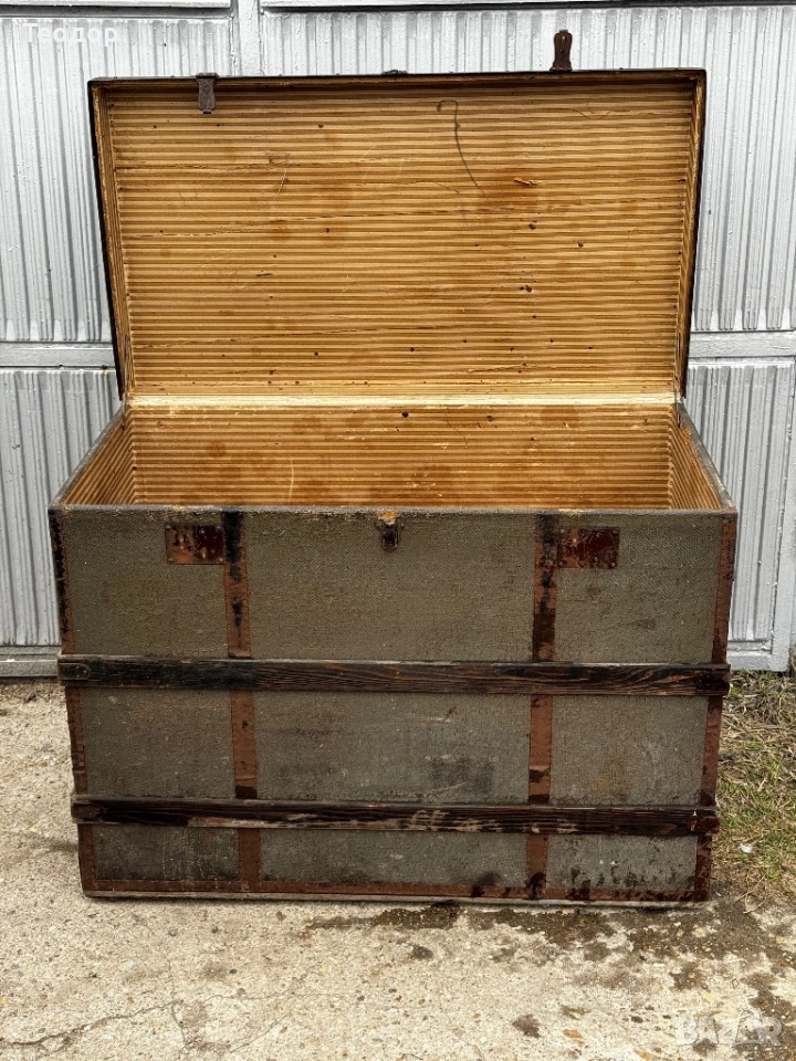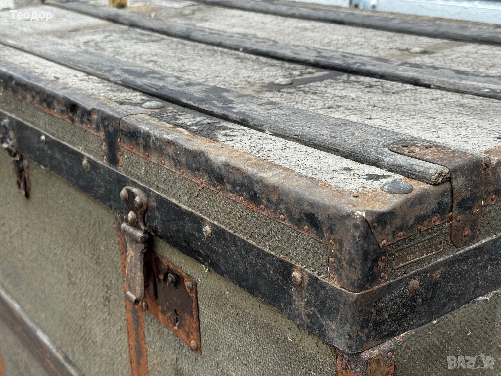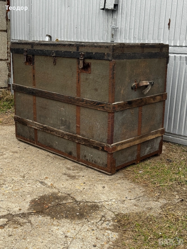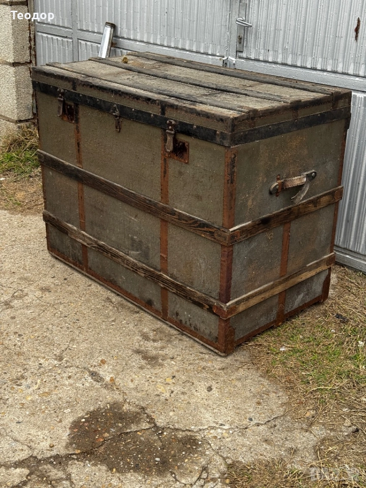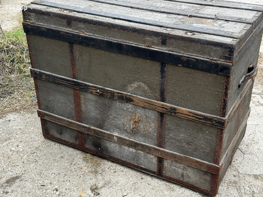 Това е изключително интересен антикварен предмет! Пред теб стои голям пътнически сандък от края на XIX или началото на XX век, произведен в Германия.