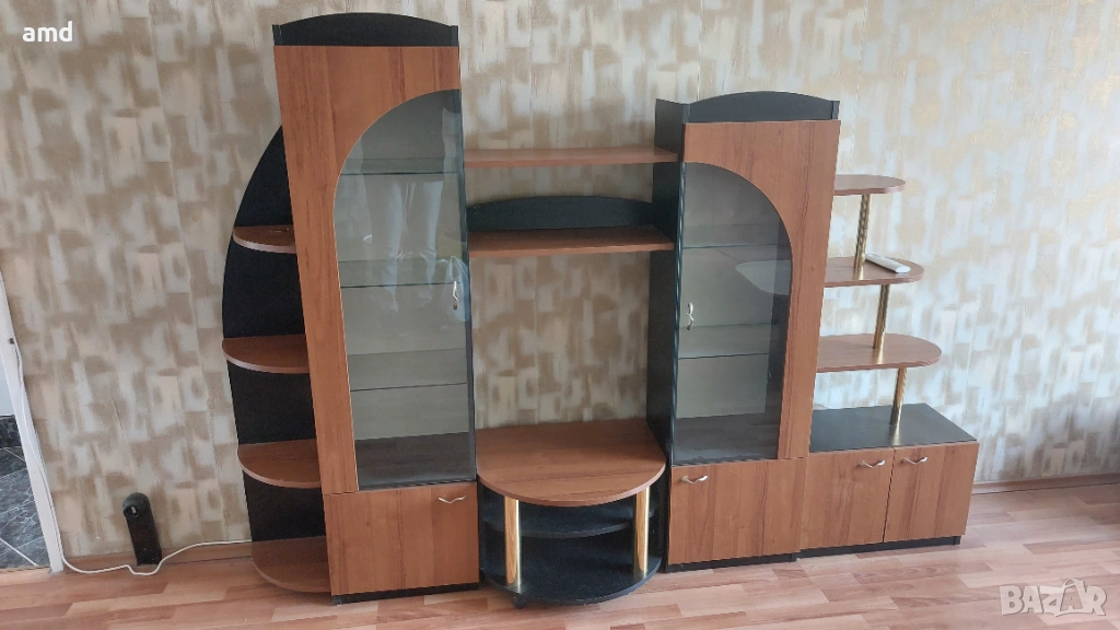 Продавам секция за дневна стая (хол )с дължина 240см, височина 174см и дълбочина 50 см (дълбочината на ТВ поставката е с най-голама дълбочина (50см), другата част от секцията е с дълбочина 32см). Изработена от комбинация от дърво и стъкло. Състои се от шкафове, рафтове и място за телевизор.