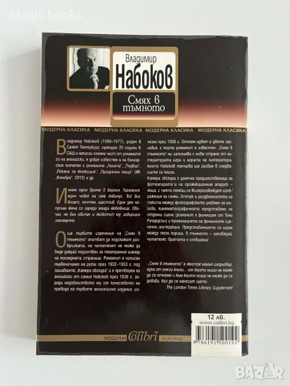 Още първите изречения на „Смях в тъмното“ опитват да подскажат развръзката, но читателят не може да бъде докрай подготвен за театралния шамар на последната страница. Романът е написан първоначално на руски през 1932–1933 г. под заглавието „Камера обскура“ и е претворен на английски от самия Набоков през 1938 г. заради недоволството му от качеството на превода на първото англоезично издание, излязло през 1936 година. Оттам идват и двете заглавия, с които романът е известен. „Смях в тъмното“ ни запознава с нови страни от литературата игра и играта на литература, които Набоков тепърва ще развие в следващите си книги.
