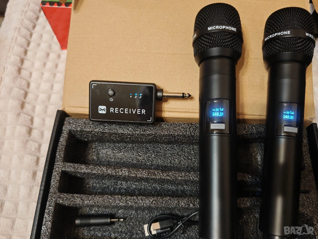 Продавам нов комплект от два безжични ръчни UHF микрофона с приемник. Захранват се с 18650 батерии (общо 2 бр. – по една за всеки микрофон). Батериите са включени.