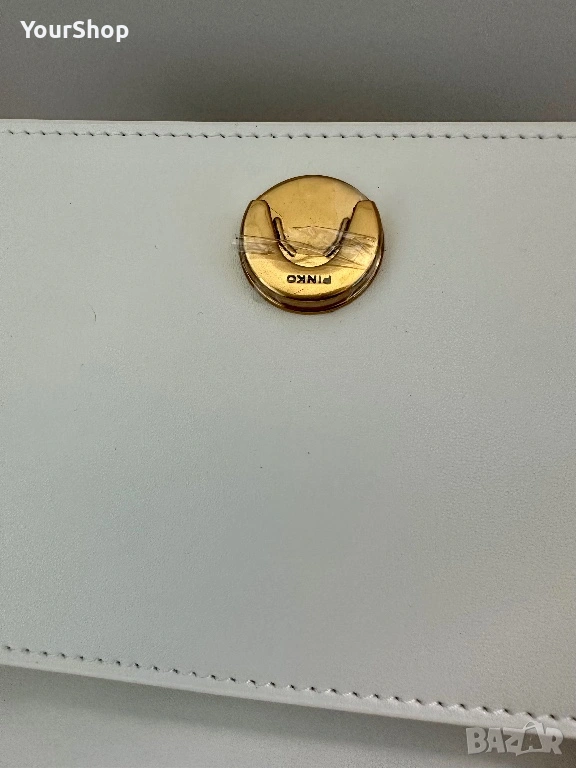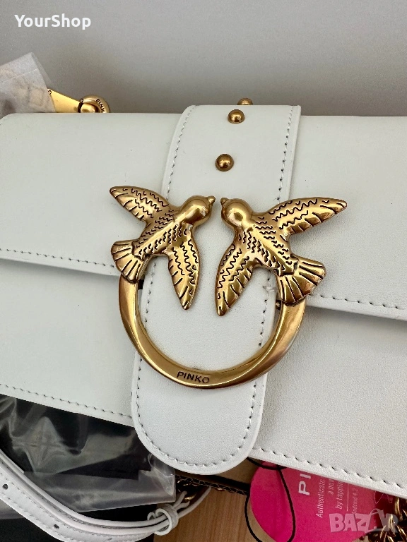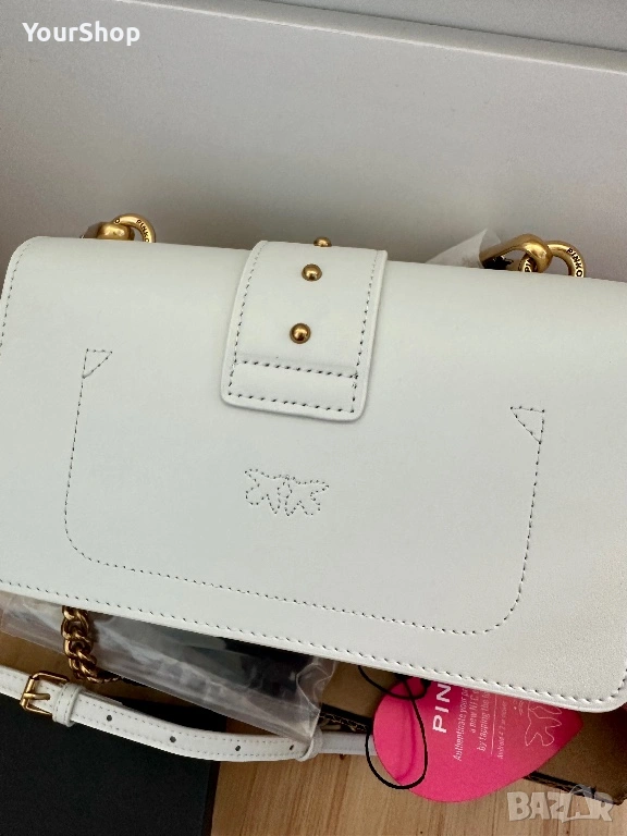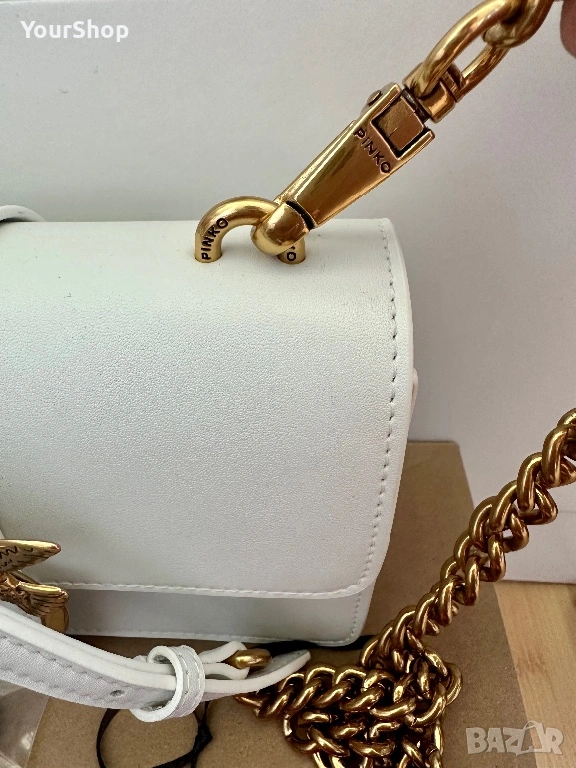 PINKO Love One Mini crossbody bag, чисто нова с етикет. Изработена от 100% телешка кожа с луксозна копринена подплата. Класически бял цвят и емблематичен Love Birds метален елемент в златисто.