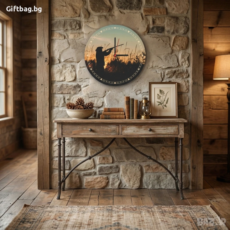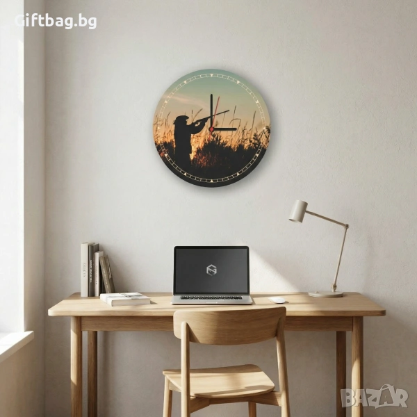 Стенен часовник „Ловец при залез“ с размер 29 см е елегантен декоративен акцент, вдъхновен от спокойствието и красотата на природата. Силуетът на ловец на фона на залязващото слънце създава топла и въздействаща атмосфера, която придава уют и характер на всяко помещение.