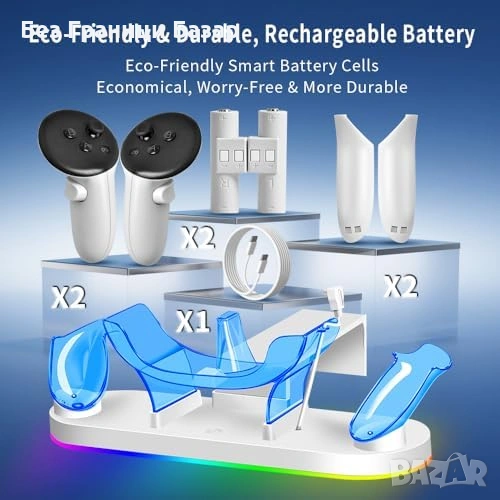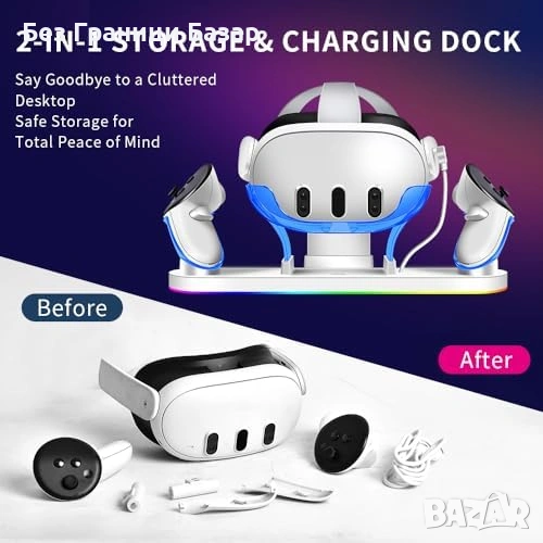 Зарежда едновременно Meta Quest 3/3S headset и 2 контролера