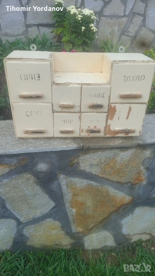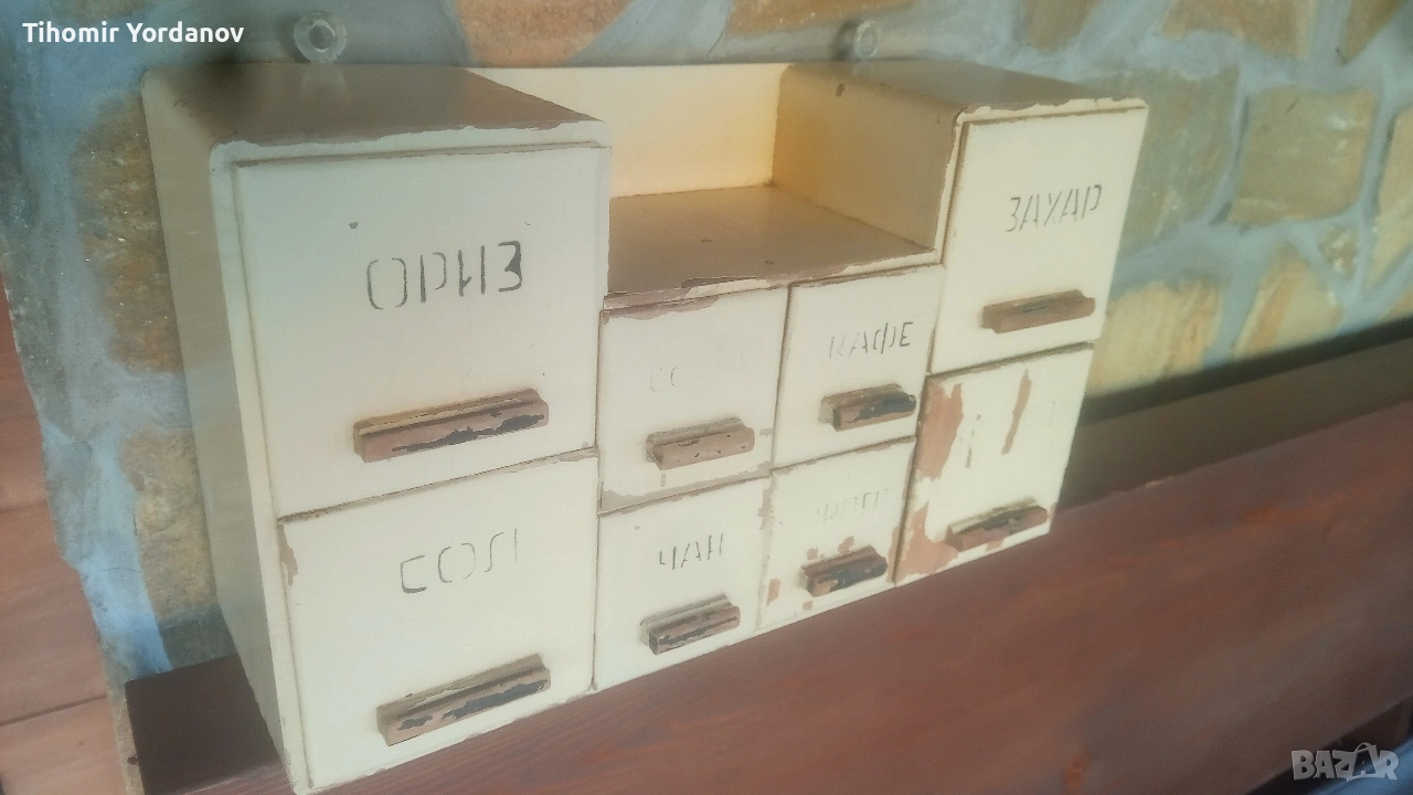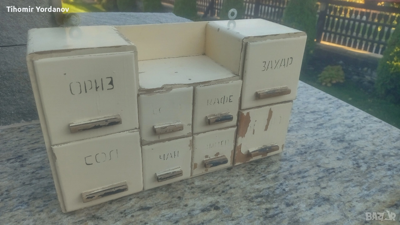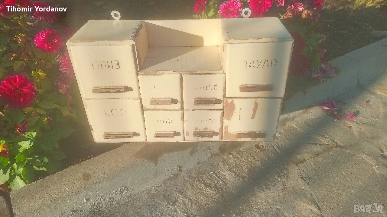 Старо дървено шкафче за подправки с чекмеджета.Здраво,в реално автентично състояние.Ьа украса и декорация.