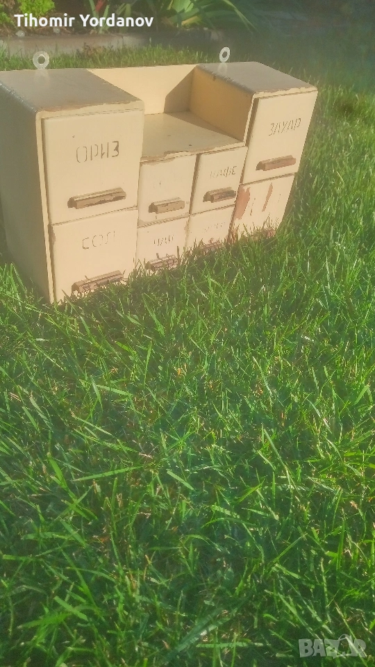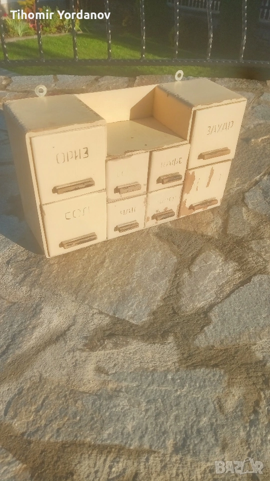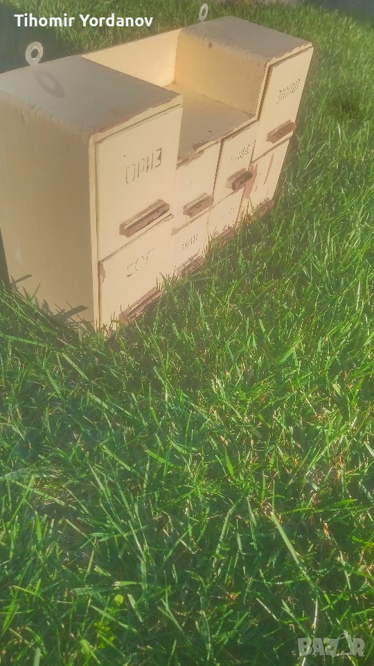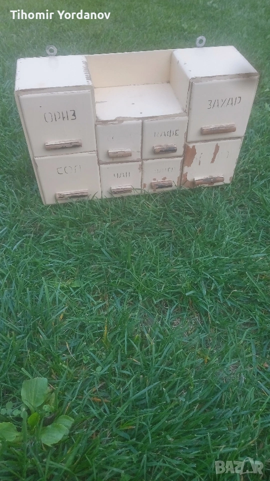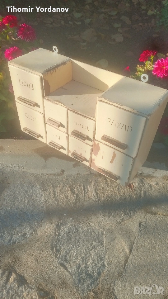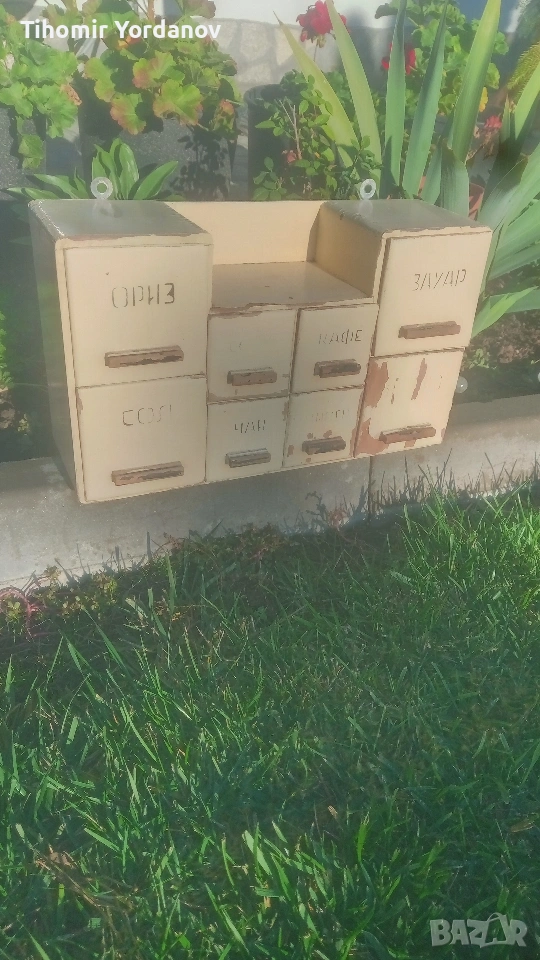 Старо дървено шкафче за подправки с чекмеджета.Здраво,в реално автентично състояние.Ьа украса и декорация.
