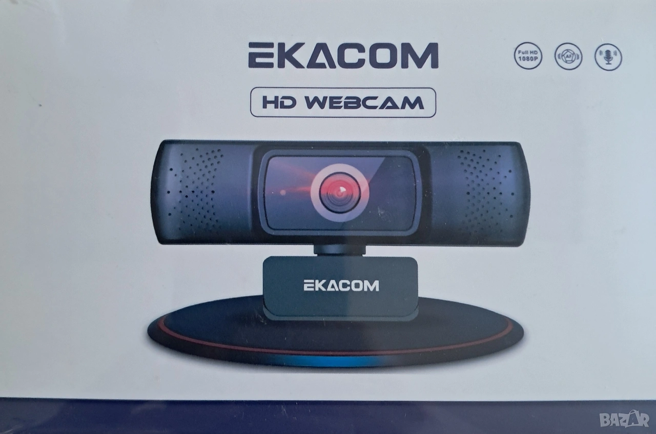 Продавам уеб камера марка "Ekacom" за компютър или лаптоп. Камерата е нова с вграден микрофон и е подходяща за онлайн срещи, стрийминг или видео обаждания.