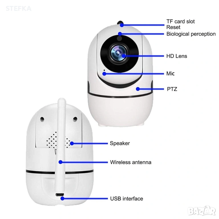Също е снабден с аларма и запис по график. Поддържа IOS и Android. Камерата е оборудвана с изводи за микрофон. Има възможност за дистанционен монитор. Продуктът, който ви предлагаме, има още Wi-fi, инфраред, видео стрийминг, засичане на движение, карта памет. Възможност за хоризонтално въртене до 355 градуса и вертикално въртене до 55 градуса. Поддържа картата памет до 64 GB. Разделителната способност е 1080 пиксела. Размерите на камера са 65х105 мм. Обективът е с размери 3,6 мм. Теглото на уреда е 0,2 кг. Мощността на продукта е 5 вата.
