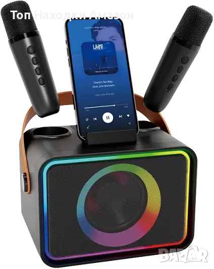 Това е преносим караоке високоговорител K26 с безжични микрофони. Тип устройство: Преносима Bluetooth караоке система. Характеристики: Включва два безжични микрофона, LED светлинни ефекти и поддържа гласови ефекти (като детски или чудовищен глас). Възможности за свързване: Bluetooth, USB диск, Micro TF карта и AUX вход.