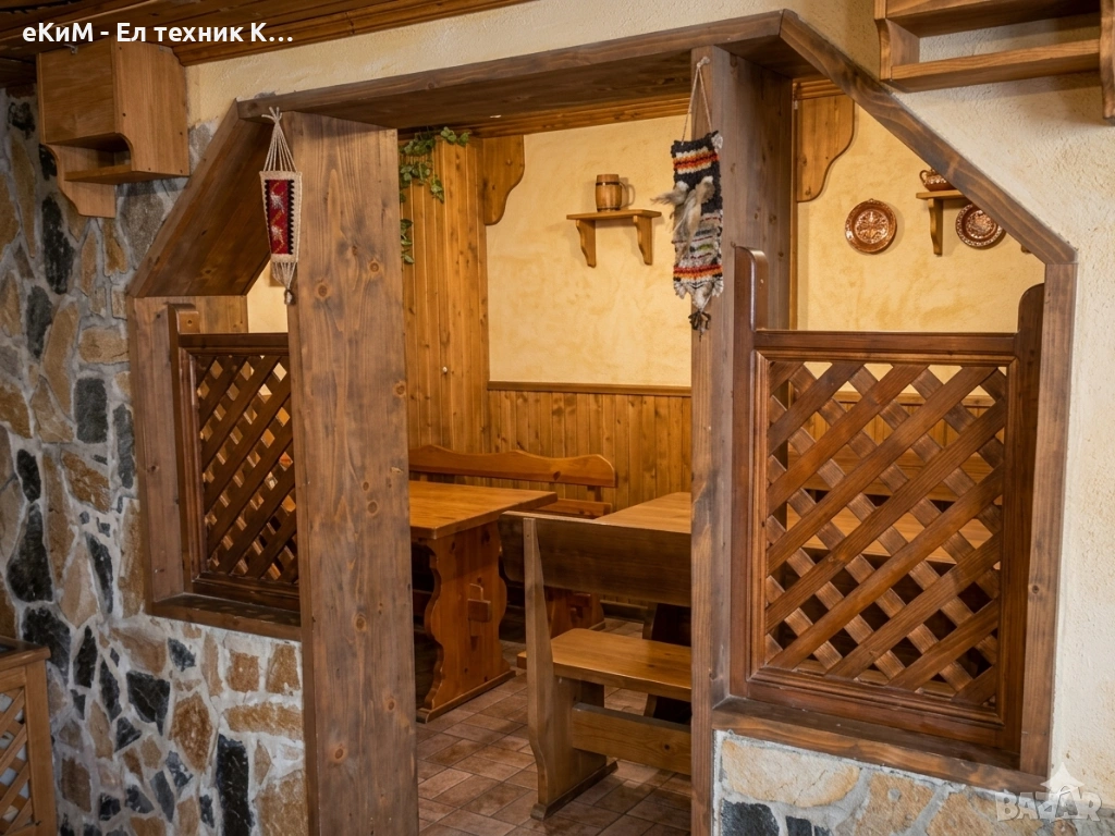 Интериор: Автентичен битов стил с масивни дървени маси и пейки, пренасящи Ви в атмосферата на старите български времена.