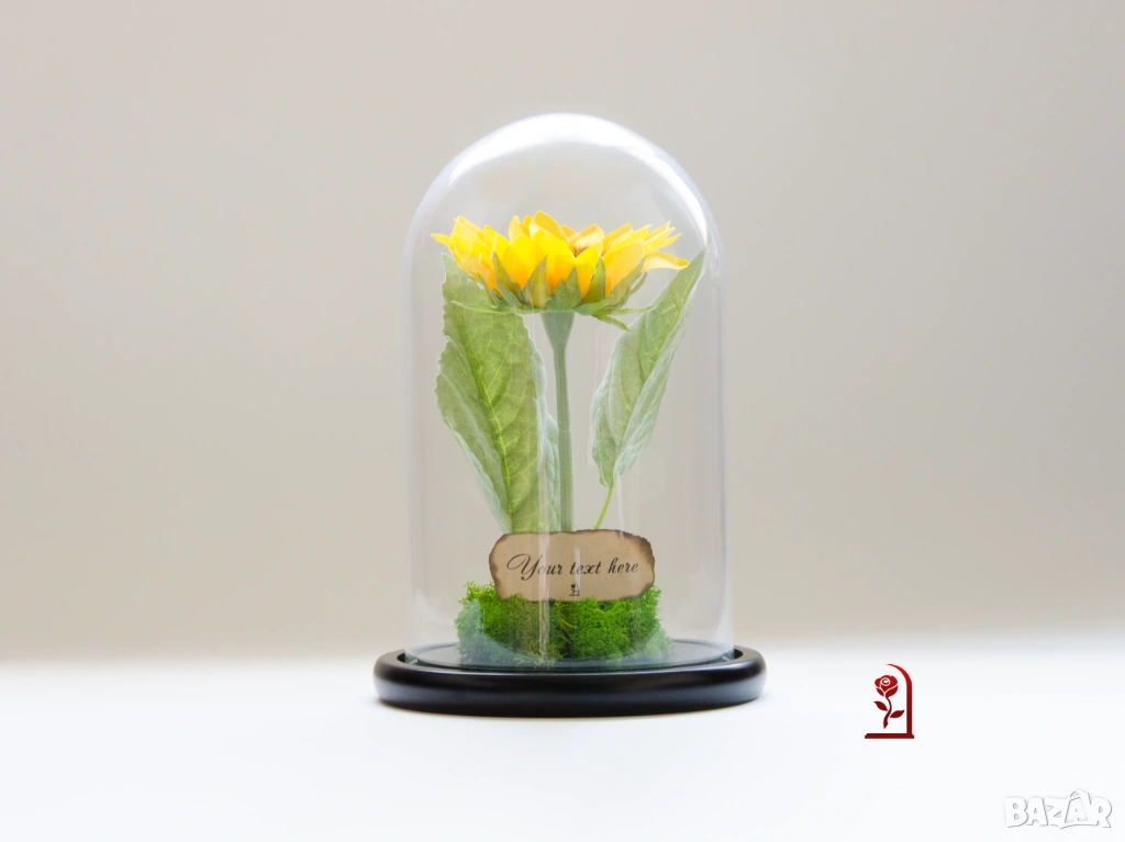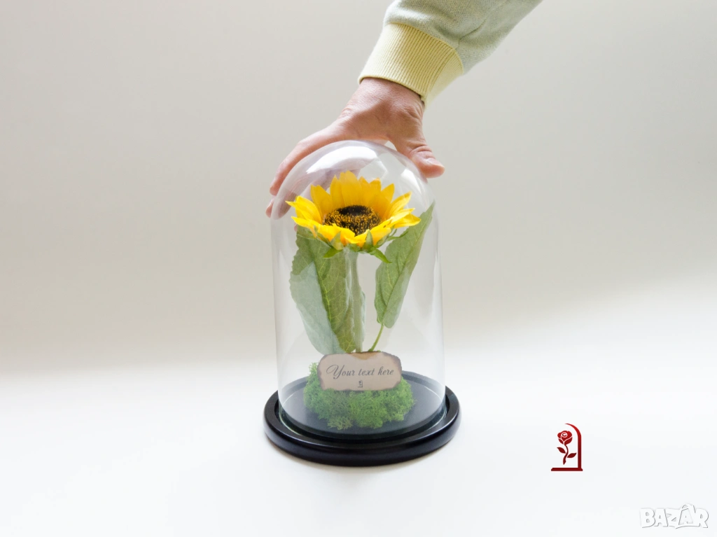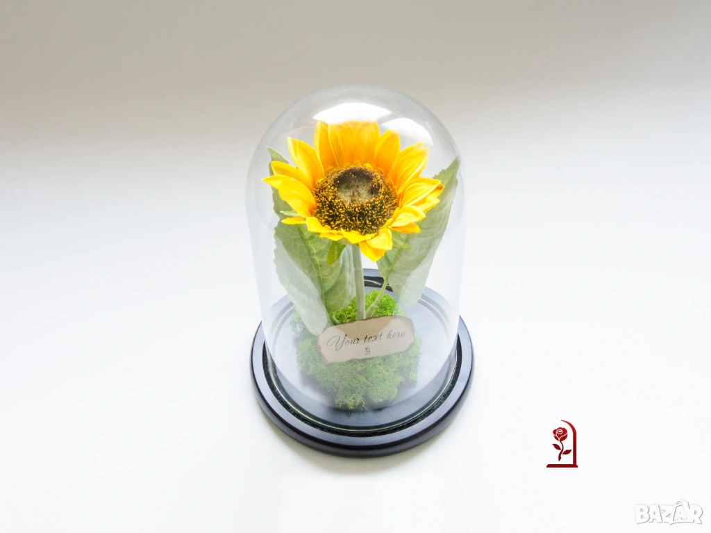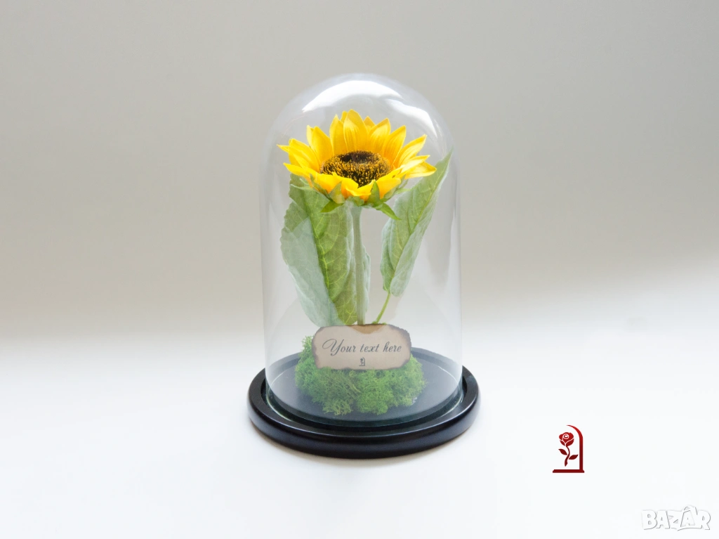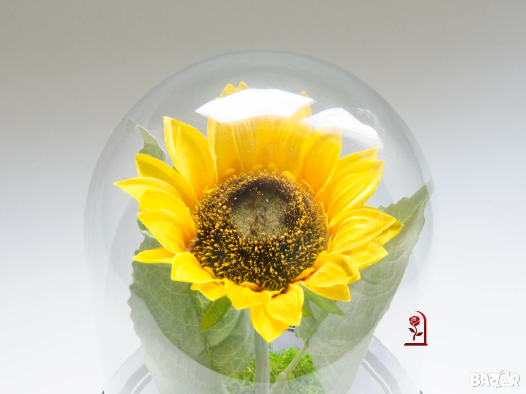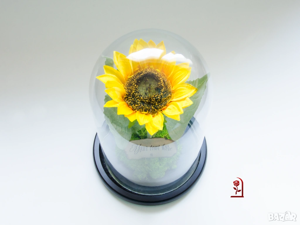 Слънчогледът носи силна позитивна символика – щастие, оптимизъм и искрени чувства. Тази ръчно изработена аранжировка съчетава вечен слънчоглед, скандинавски мъх и стилен стъклен купол. Тя е създадена, за да предава положителна емоции и да радва дълго време.