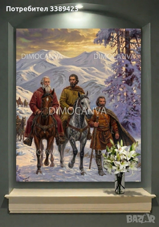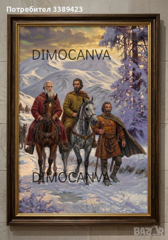 Внушително художествено произведение, изобразяващо ключовия исторически момент на пристигането на светите братя Кирил и Методий. Картината е изпълнена в класически маслен стил, пресъздаващ автентичната атмосфера на Златния век и величието на българската просвета. Дизайнът е изцяло авторски, създаден с внимание към детайла, което го прави коренно различен от стандартните репродукции.