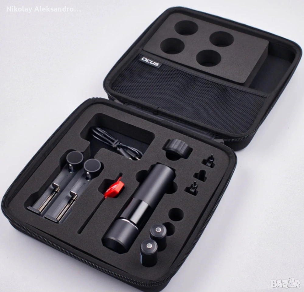 M1 се предлага в практичен куфар за пътуване, оборудван с 2 батерии и съответстващо зарядно устройство, 3 задвижващи глави, инструменти, ръководство за употреба и няколко резервни О-пръстена.