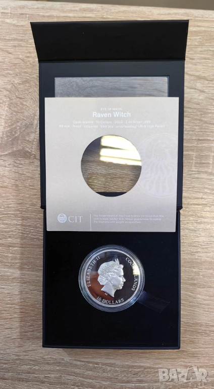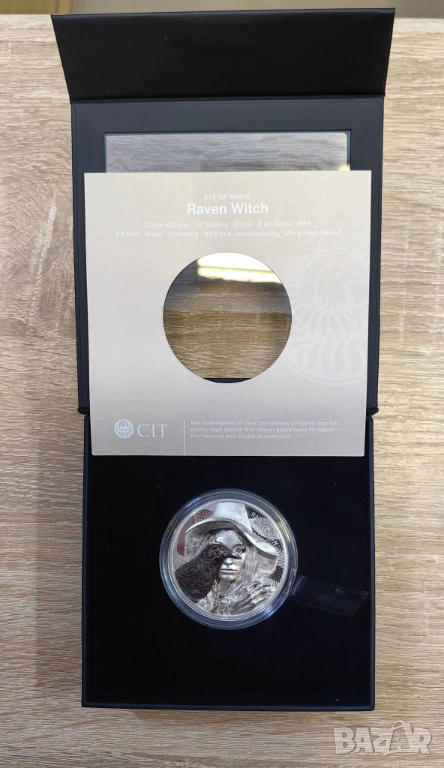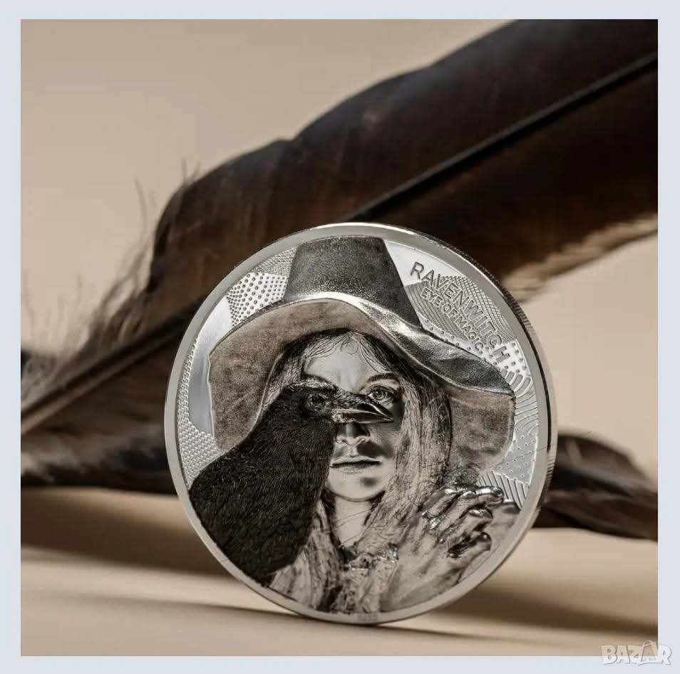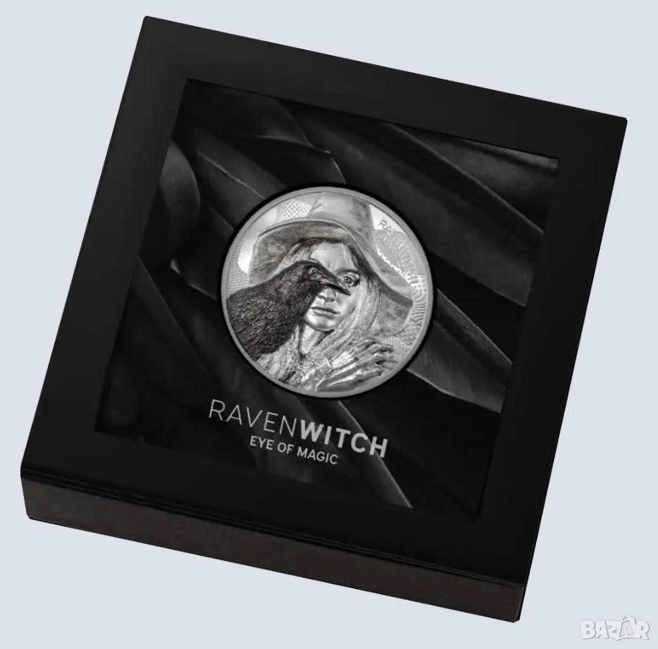 Тази монета, отсечена от 2 унции сребро 99,9% проба, изобразява вещица с верния ѝ спътник, гарвана. Двете споделят окото на магията, което гледа през пространството и времето и свързва материалния свят със света на духовете. Заедно те излъчват зловеща аура, която е особено подсилена от връзката им с природата, смъртта и непознатото. В дизайна са включени и надписите "RAVEN WITCH" и "EYE OF MAGIC", магическото дуо ясно се откроява с особено детайлен и реалистичен вид. На обратната страна е изобразен портретът на Нейно Величество кралица Елизабет II от Иън Ранк-Бродли, надписът "COOK ISLANDS" и номиналната стойност "10 DOLLARS". Уникалната емисия е строго ограничена до само 999 броя по целия свят. Сребърната монета с ултра висок релеф в качество proof се доставя в оригиналната кутия, включително сертификат за автентичност.