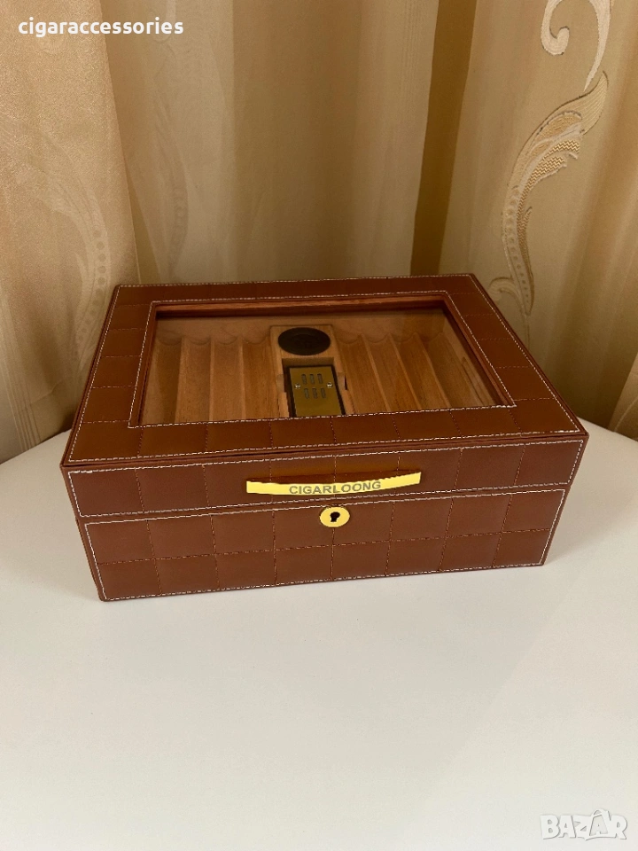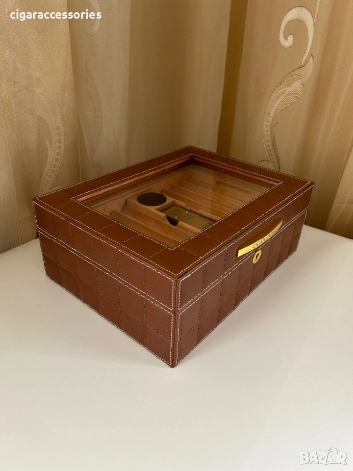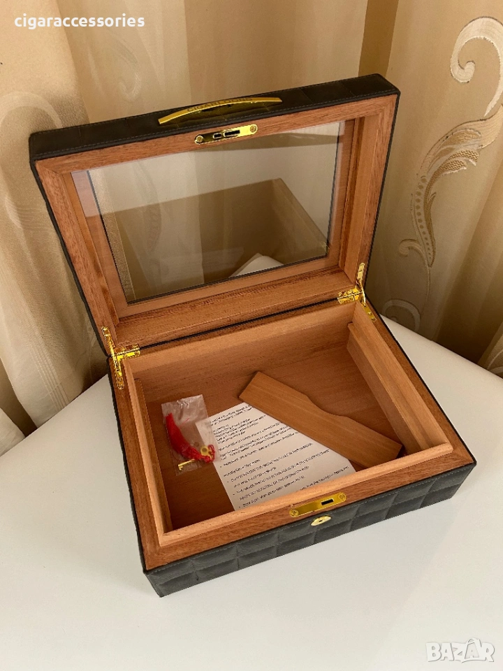 Хумидор за 50 пури – кедър, кожа, стъкло, дигитален хигрометър