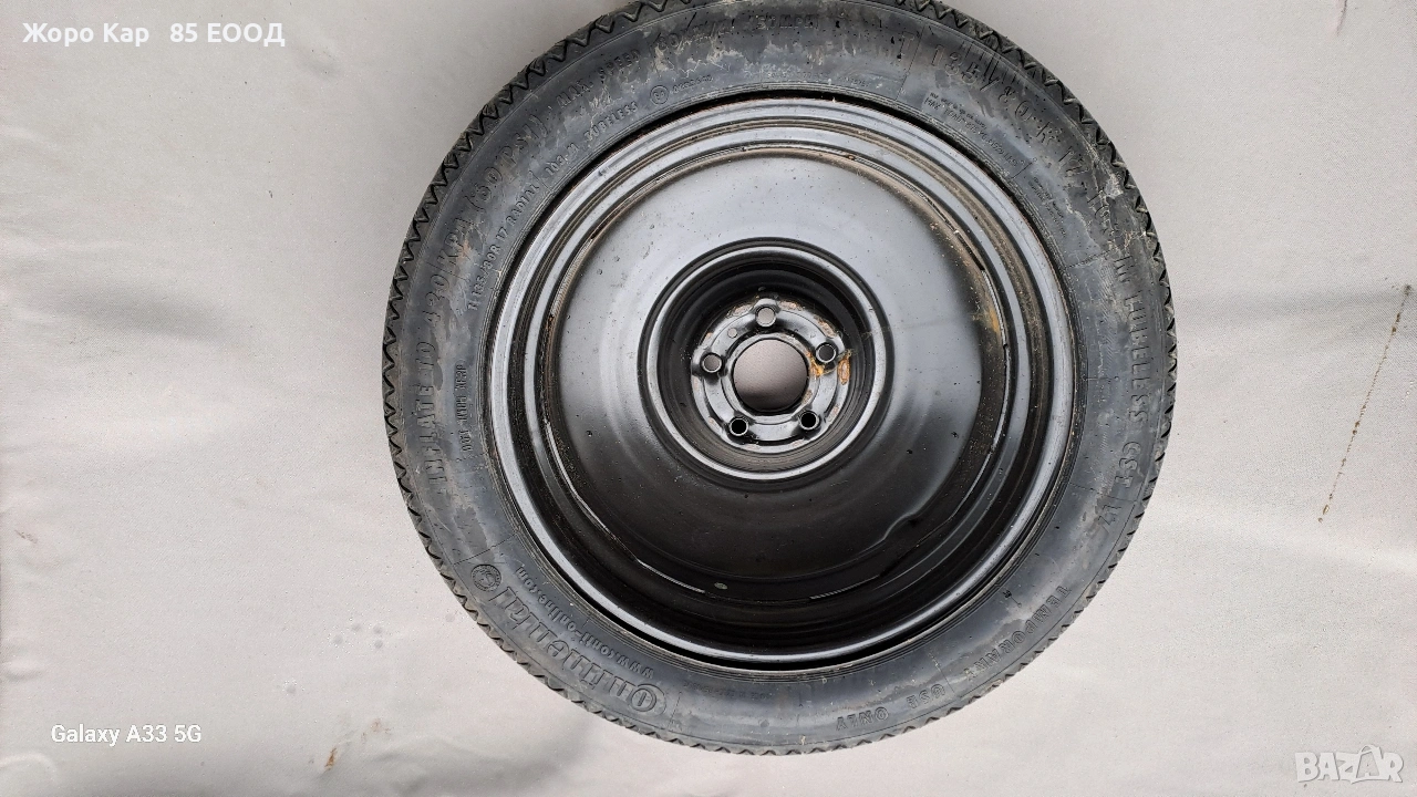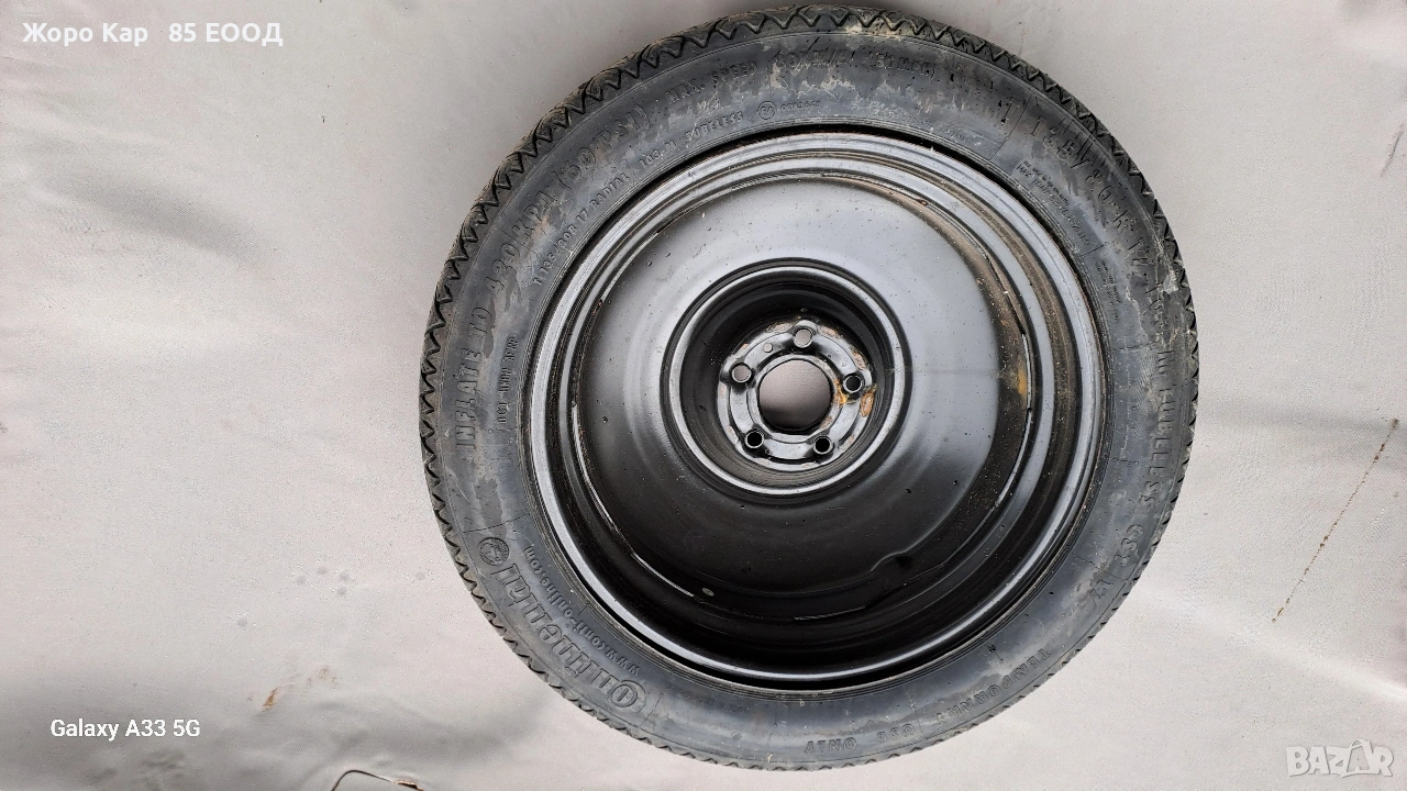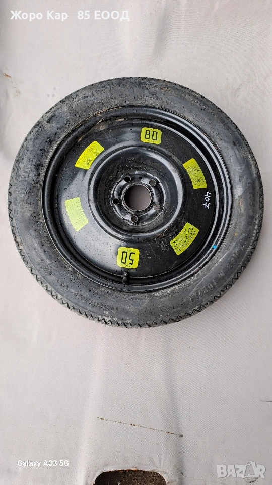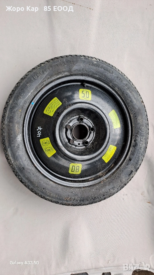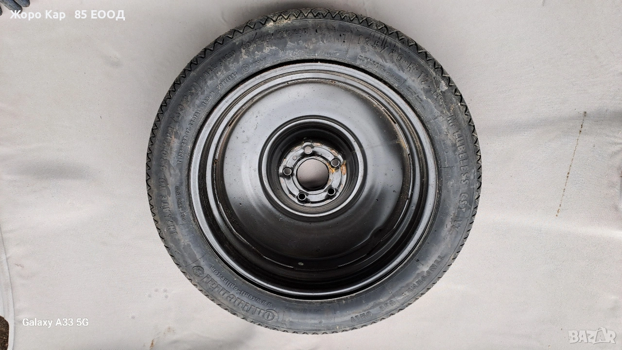 Резервна гума - патерица 17 цола 5х108 центр. отвор 65.1 Пежо 407 Peugeot 407 T135/80/17 ET-41 Автоморга " Жоро Кар 85 ЕООД" разполага с голямо разнообразие от автомобили на части! Работим с куриери в цялата страна , като всяка част се изпраща с опция. Гарантираме качество и коректност при продажба ! Работно време : Понеделник - Петък : 09.00ч - 18.00ч Събота :Почивен ден Неделя : Почивен ден