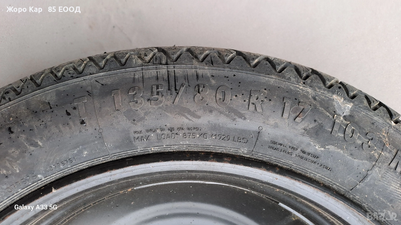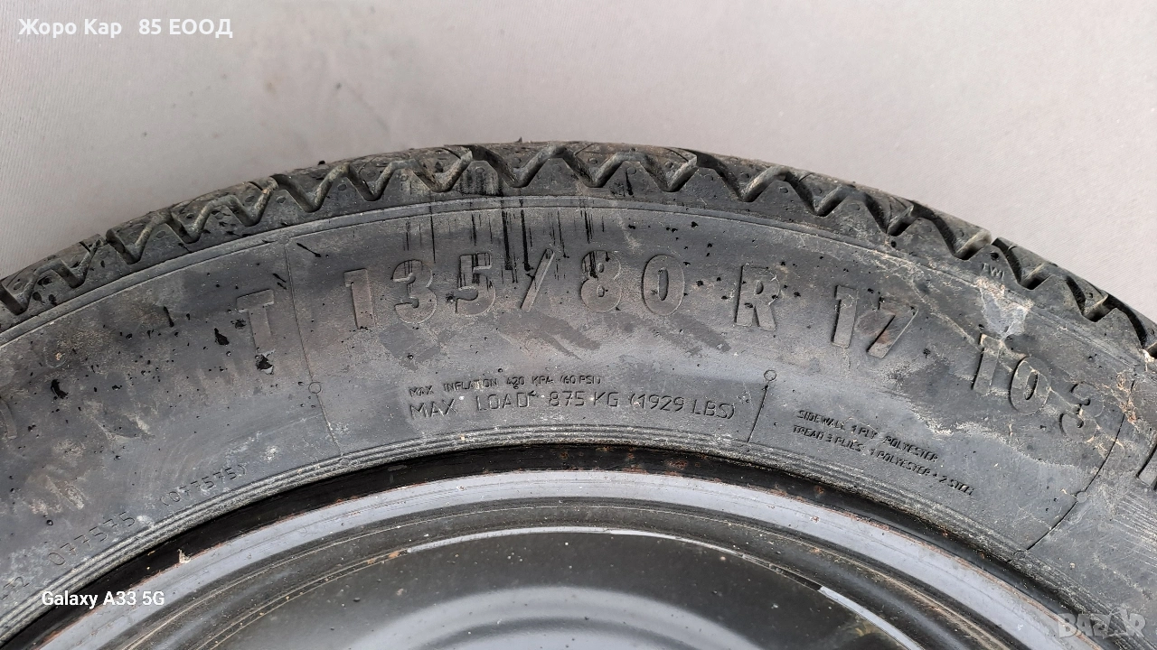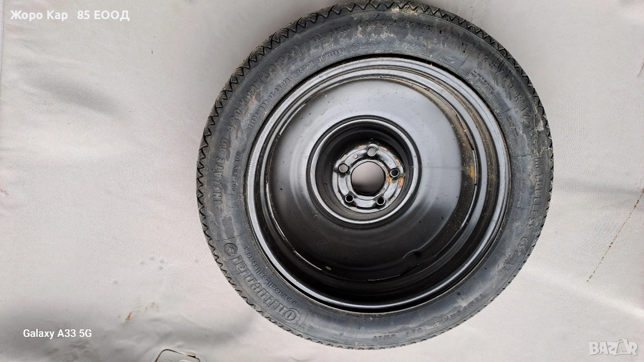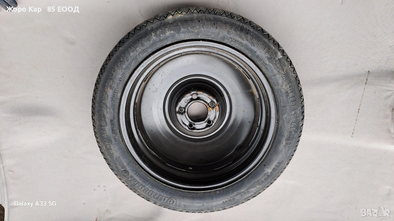 Резервна гума - патерица 17 цола 5х108 центр. отвор 65.1 Пежо 407 Peugeot 407 T135/80/17 ET-41 Автоморга " Жоро Кар 85 ЕООД" разполага с голямо разнообразие от автомобили на части! Работим с куриери в цялата страна , като всяка част се изпраща с опция. Гарантираме качество и коректност при продажба ! Работно време : Понеделник - Петък : 09.00ч - 18.00ч Събота :Почивен ден Неделя : Почивен ден