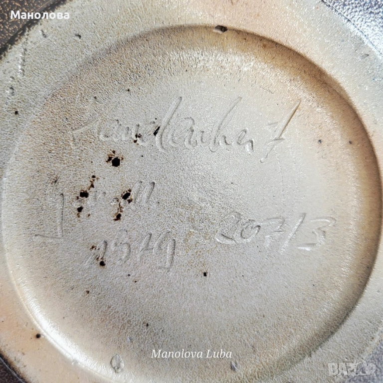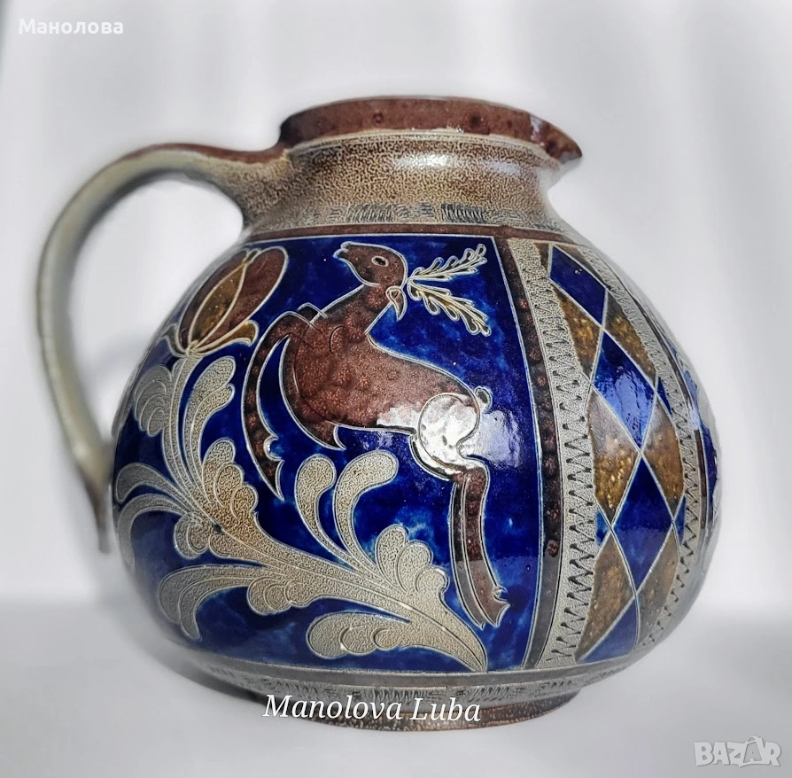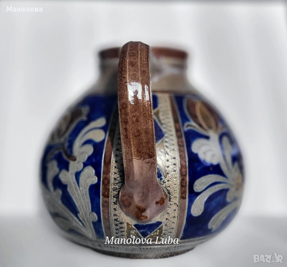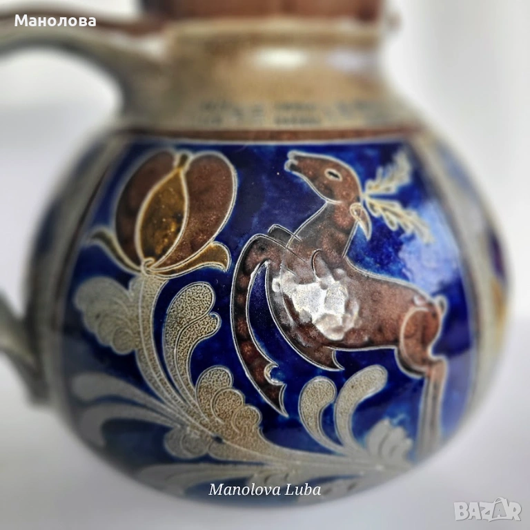 Ръчно рисувани мотиви с флорални елементи и стилизирани животни. Тези кани са високо ценени от колекционерите заради своята здравина и специфична естетика, като често се използват за сервиране на напитки или като декоративни елементи. На дъното има надпис Handarbeit „ръчна изработка“, числовия код обикновено представлява номера на модела, формата или размера, използван от производителя за инвентаризация. Стилът е характерен за края на XIX или началото на XX век. Добавете нотка автентичност към дома си с това уникално произведение.