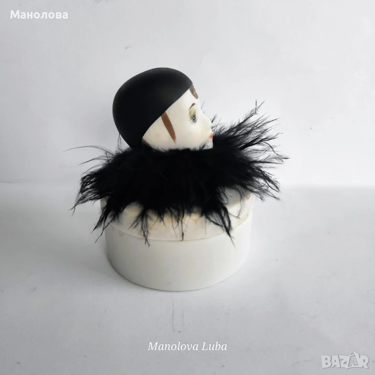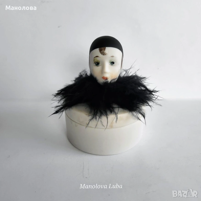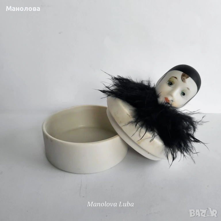 Изработена от не глазиран или матиран (бисквитен) порцелан. Капака е с клоуна Пиеро с истински пера, тези фигура често е вдъхновена от стила Art Deko и е била популярна като аксесоар за тоалетки през 80-те години на миналия век. Използва се за съхранение на пръстени, малки бижута или като декоративна кутийка за пудра. Много от тези винтидж модели са произведени в Япония. В много добро винтидж състояние, моля разгледайте снимките!