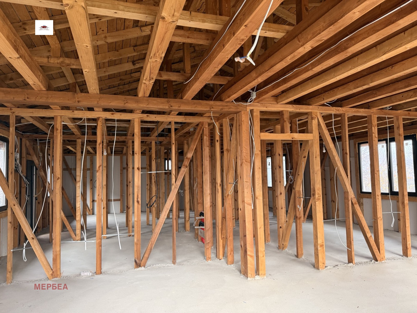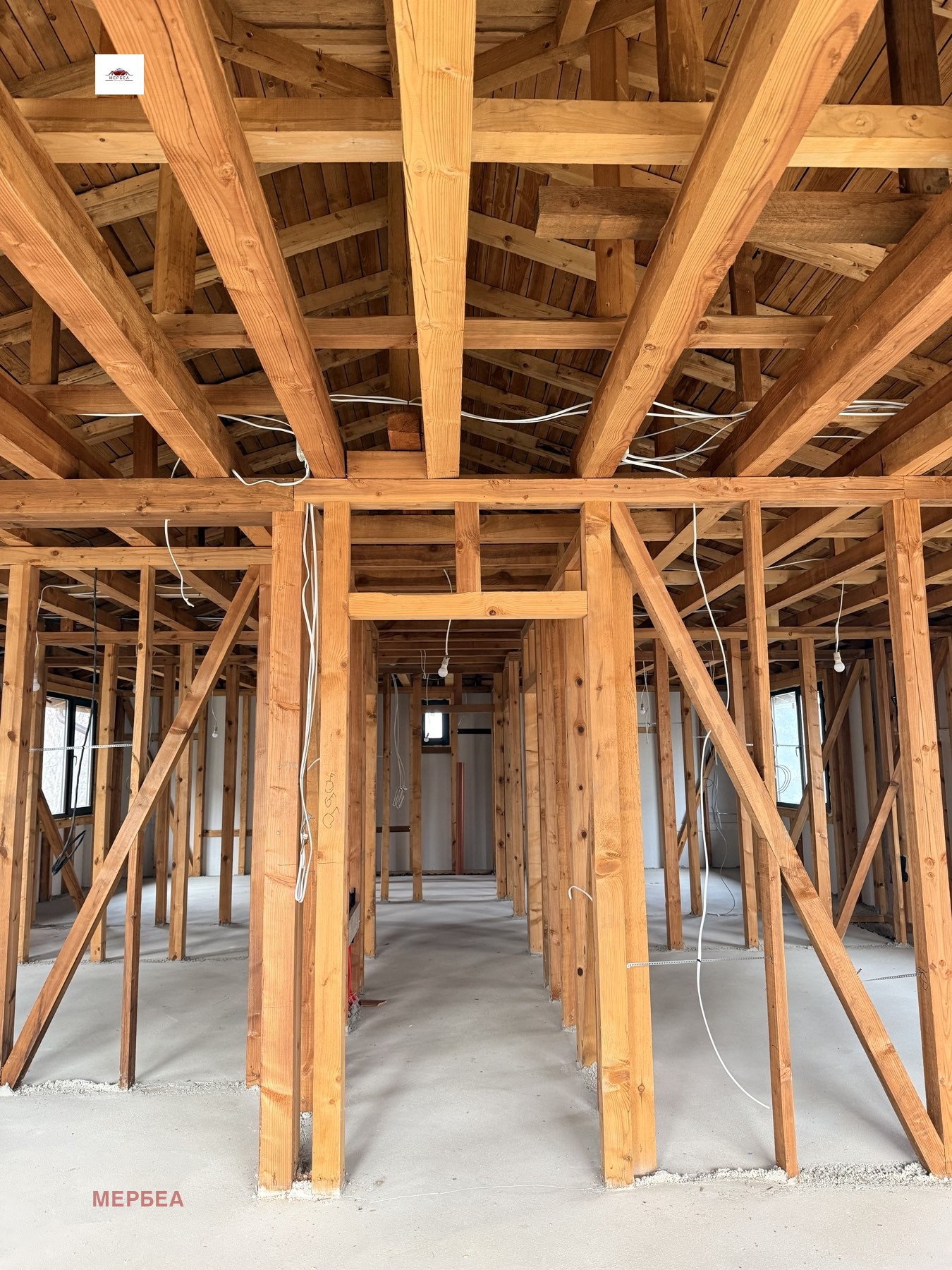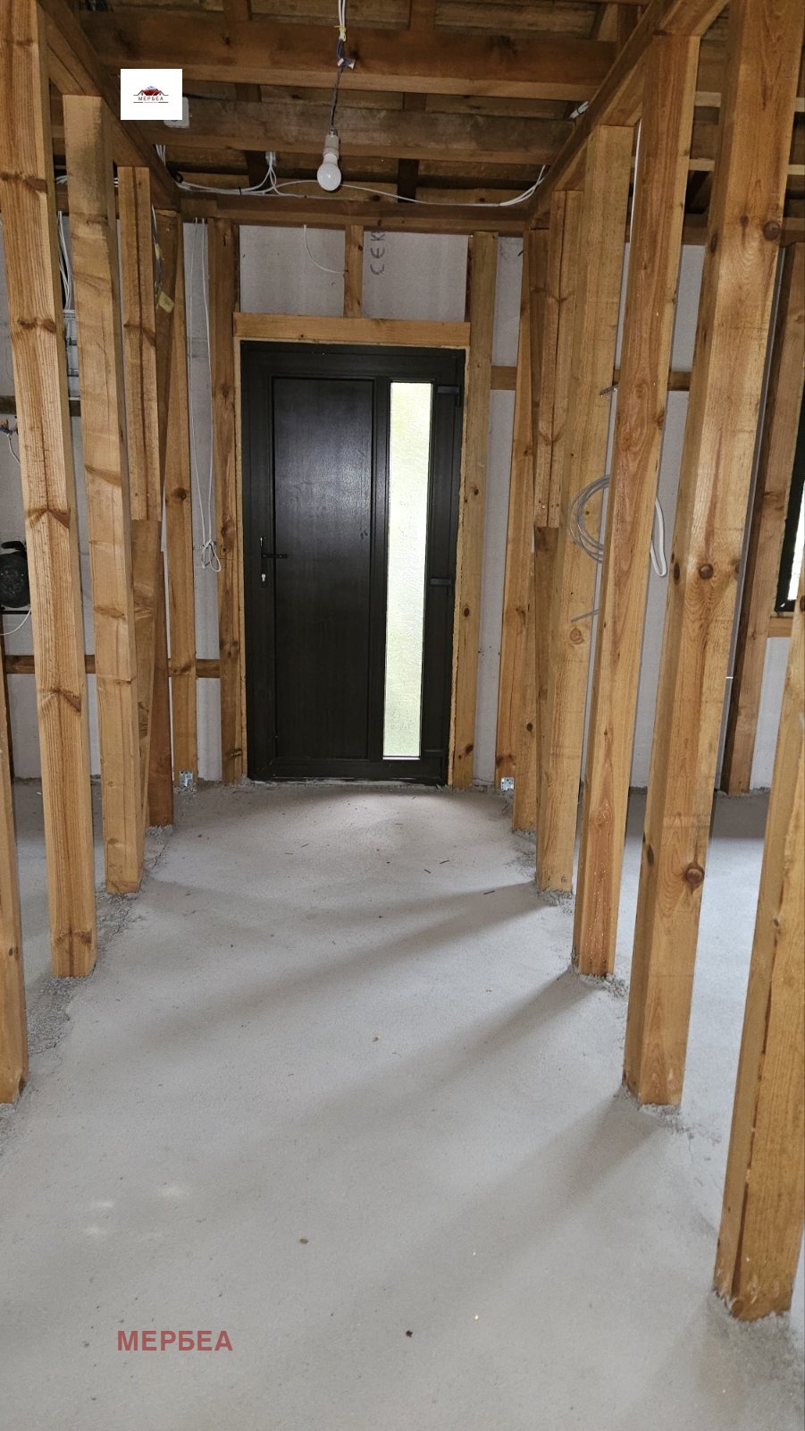 Къщата е покрита, изградено е подово отопление, преградните стени са фиксирани с греди, дограма на всички помещения.Има ток, вода, канализация.Около къщата е изграден дренаж.За повече информация на посочения телефонен номер