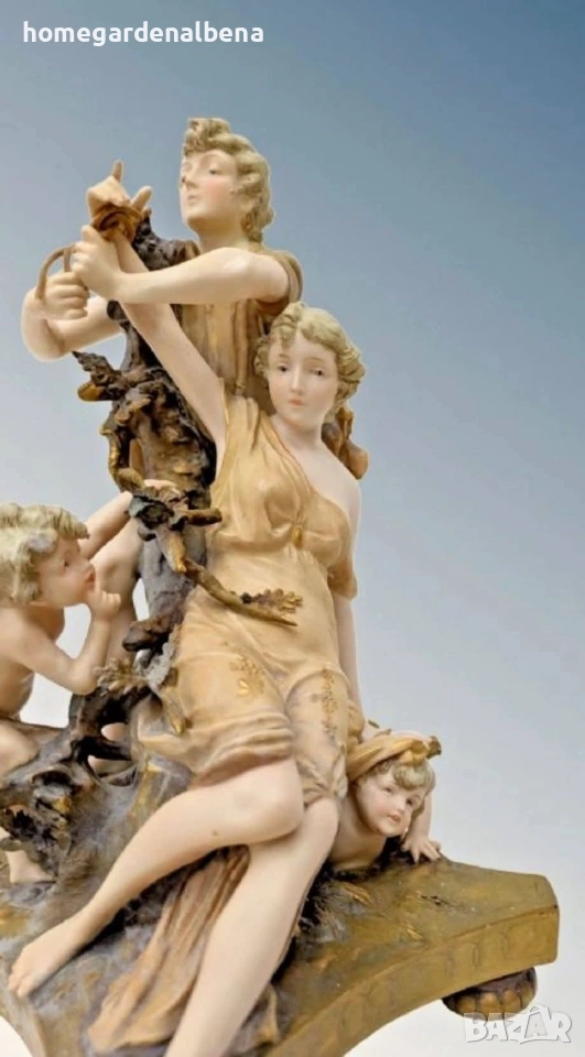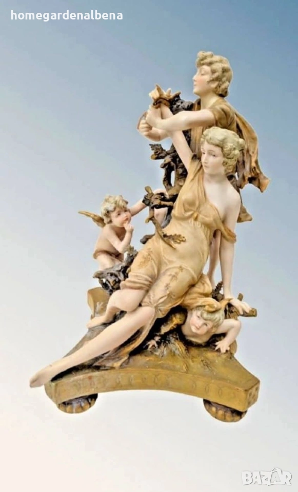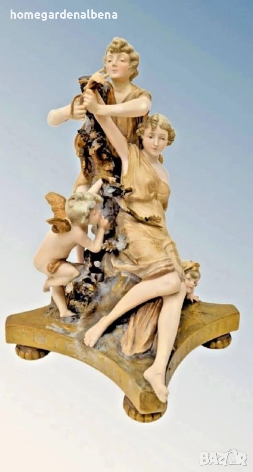 Монументална порцеланова скулптурна група от австрийската манифактура Ernst Wahliss, Turn, Austria — три изящни фигури и купидон в динамична алегорична композиция. Изваяна с висок майсторски финес и богата детайлност в кремаво-охрова и злато-кафява гама, характерна за виенския академизъм от края на 19-ти век. Автентична маркировка Ernst Wahliss · Turn · Austria. Височина около 27 см. Много добро винтидж състояние — незначителна стара реставрация по едно крилце на купидона. Рядък колекционерски екземпляр с висока аукционна стойност. Доставка 10–14 дни, наложен платеж. Цена: 1 399.99 €