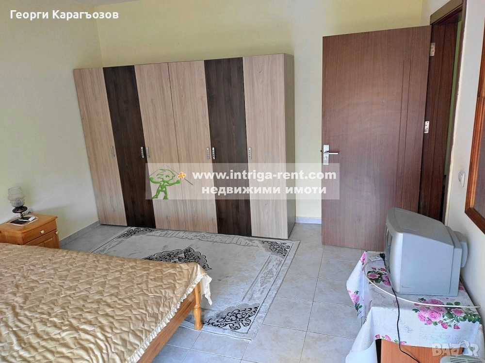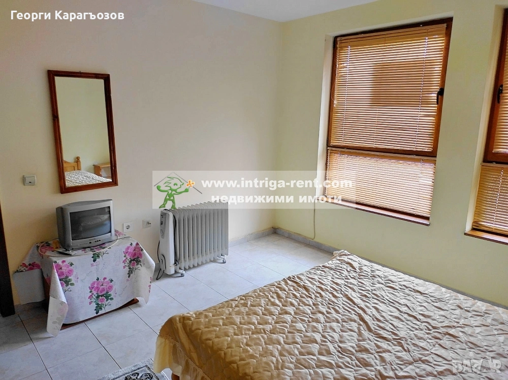 - спалня: двуперсонно легло, ТВ - маса и малък телевизор, маслен радиатор за отопление, 2 броя нощни шкафчета с една лампа, шесткрилен гардероб, подов килим