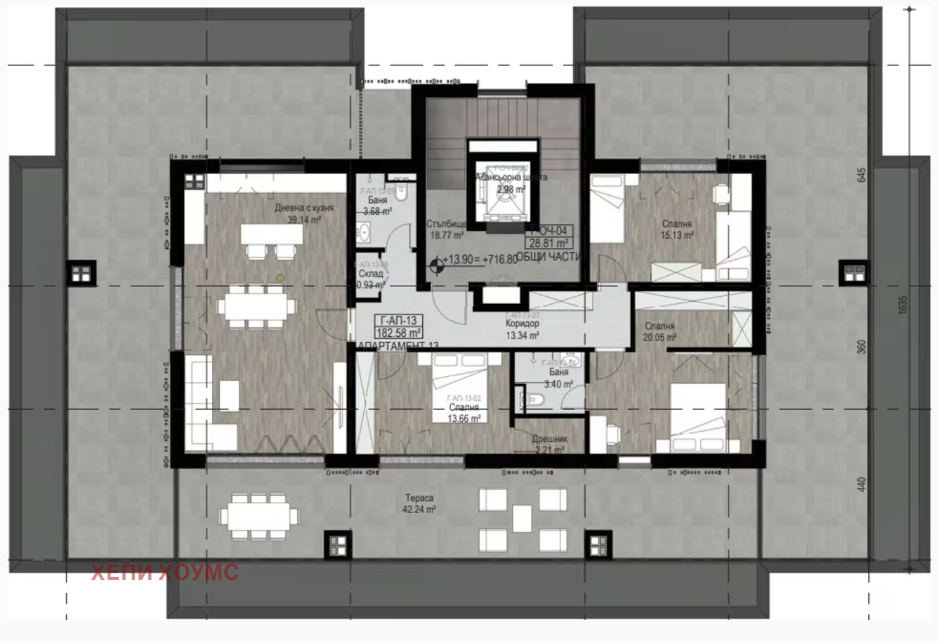 Апартамента се намира на последен етаж и е с площ 182.58 кв. м. и е със следното разпределение: