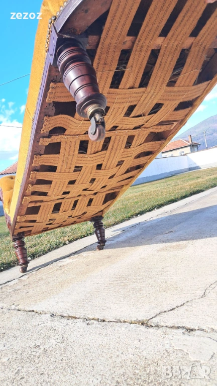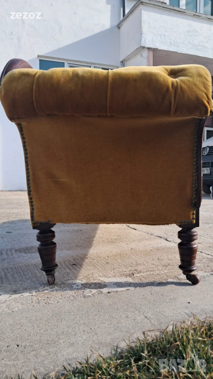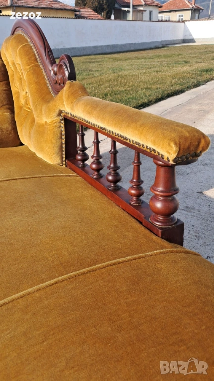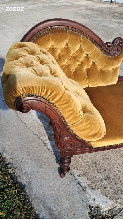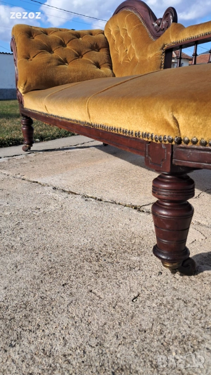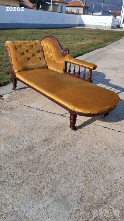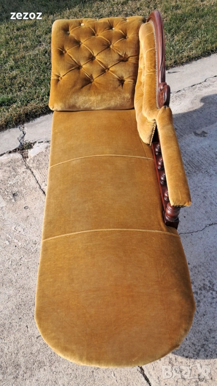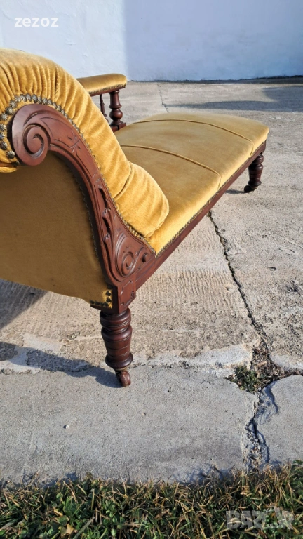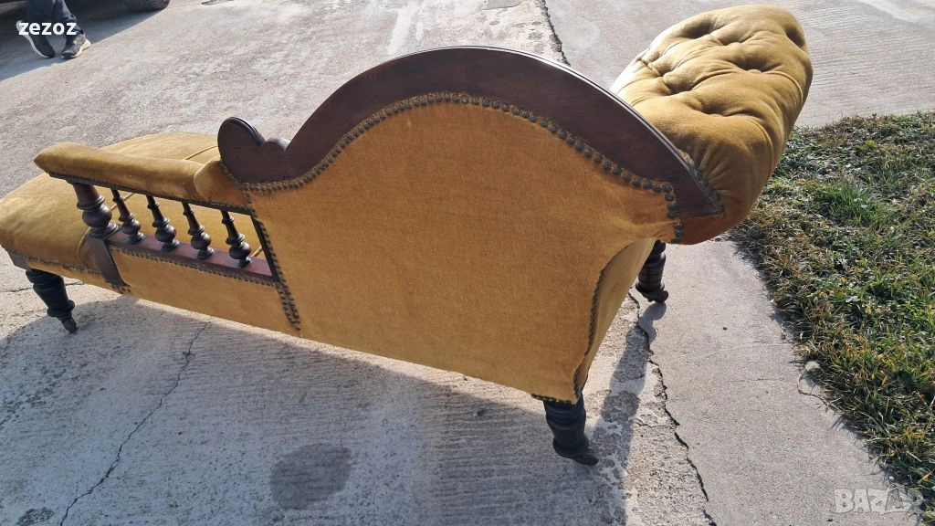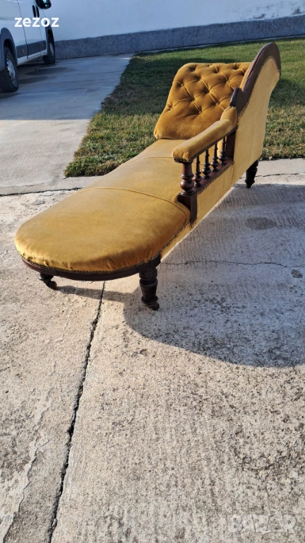 Антикварна лежанка-шезлонг от края на 19 век,началото на 20век."Chaise Longue",по-известна като "кушетка за припадане".Конструкция масив.Оригиналните колела на крачетата.Дърворезба по корпуса на облегалката.Капитонирана облегалка.Плюшена дамаска в много добро състояние.Старата система от пружини и ремъци на седалката.За достолепните си години е конструктивно здрава и запазена.Размери-