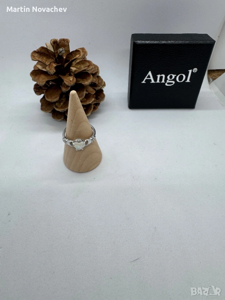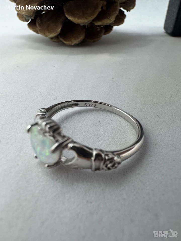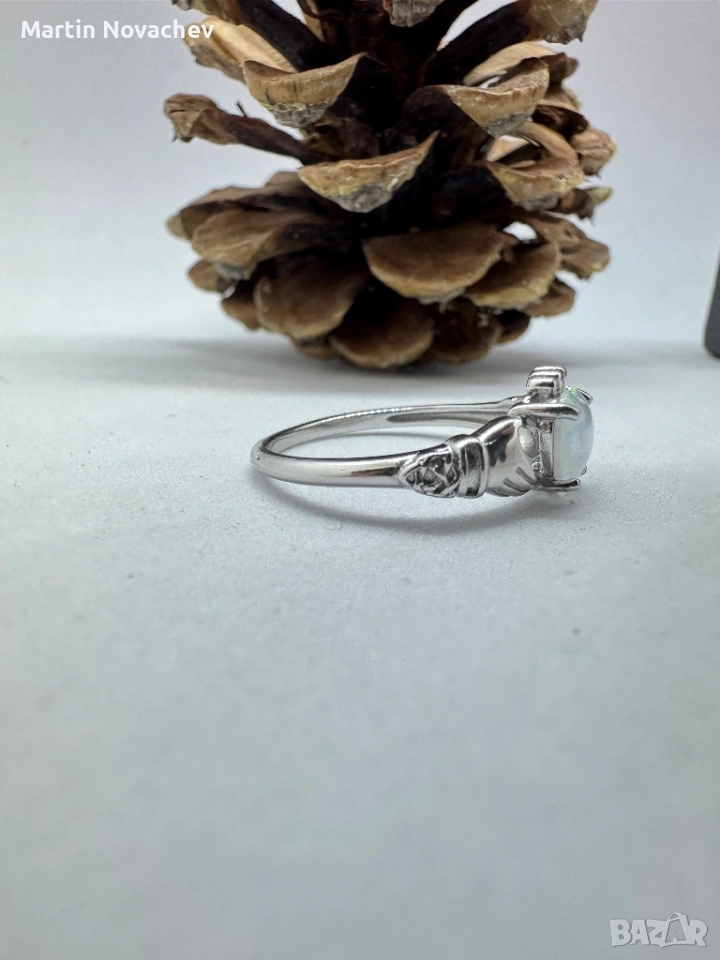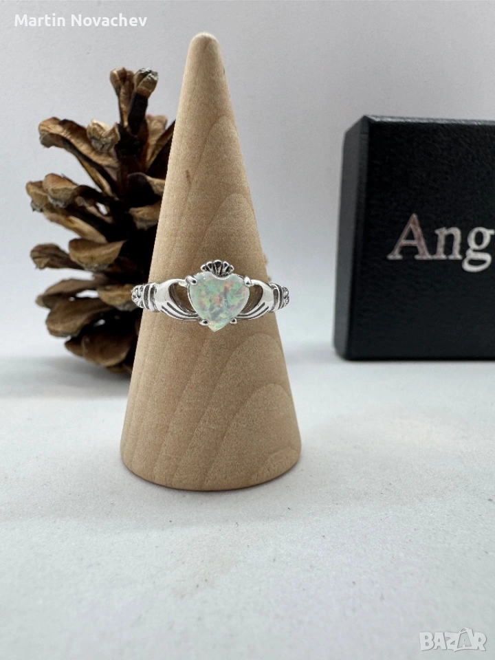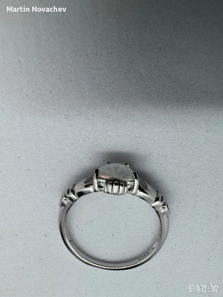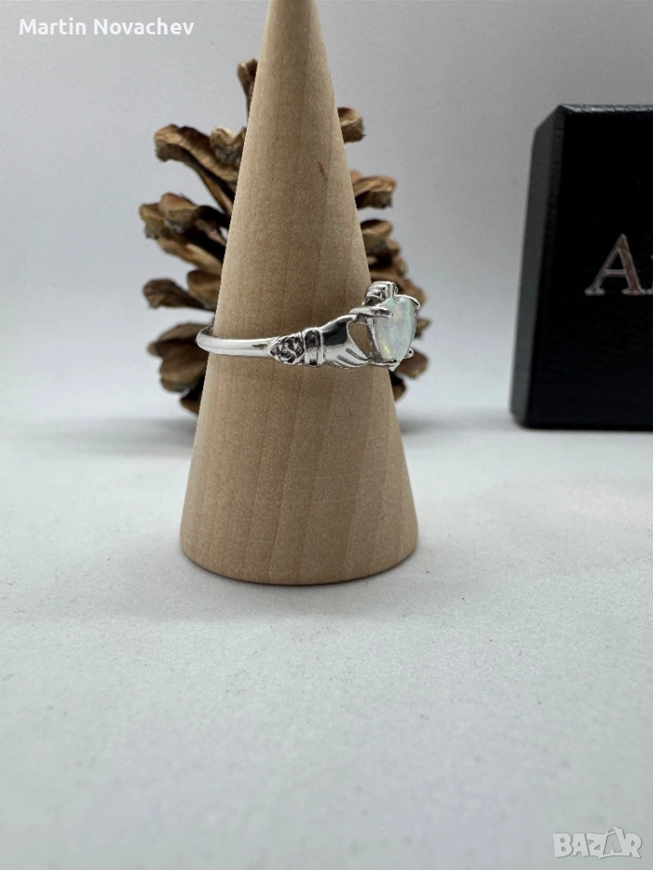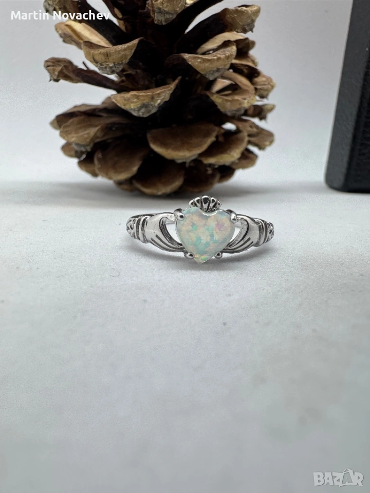Елегантен пръстен от сребро с красив камък във формата на сърце, имитиращ опал. Камъкът прелива в нежни цветове и създава изключителен блясък при светлина.