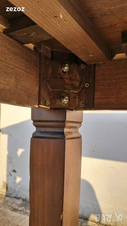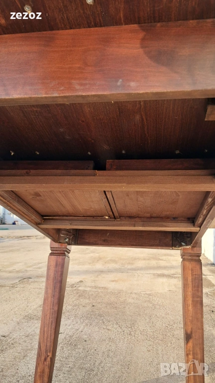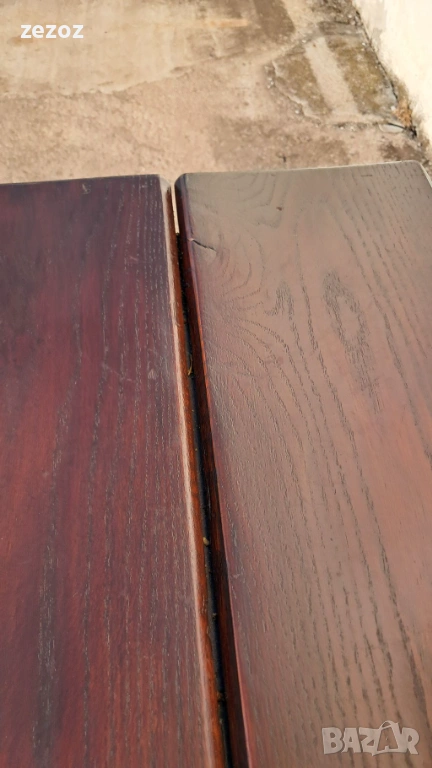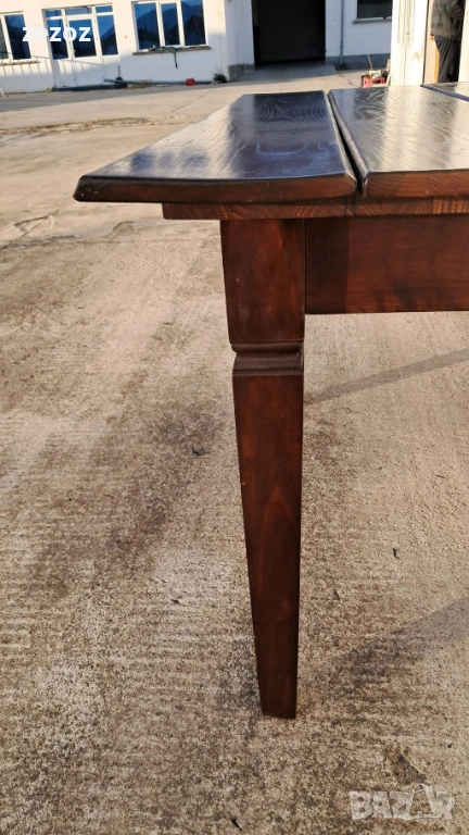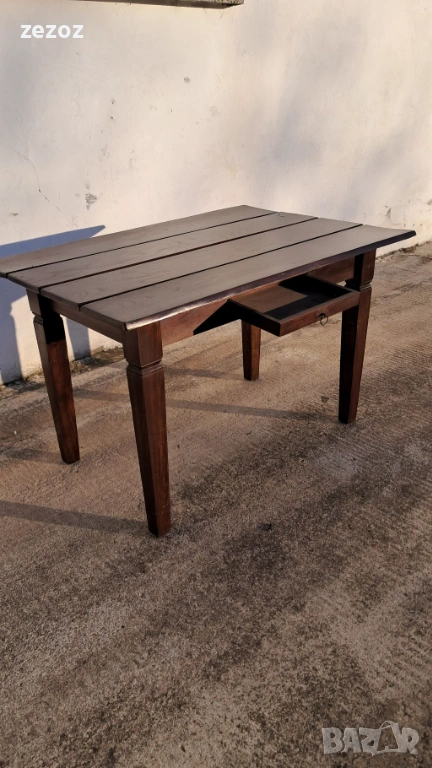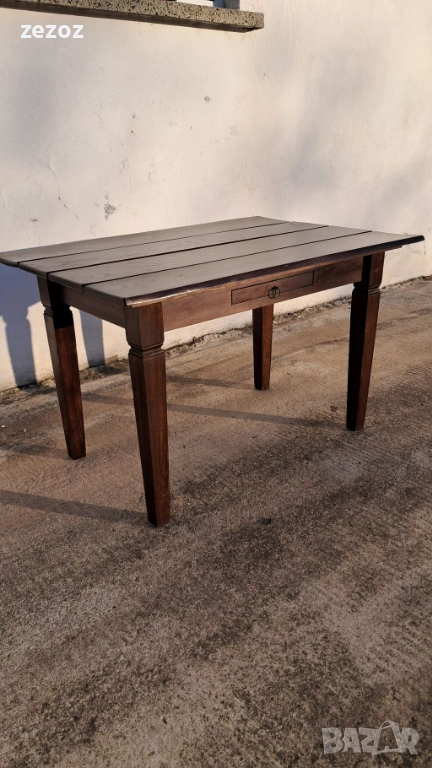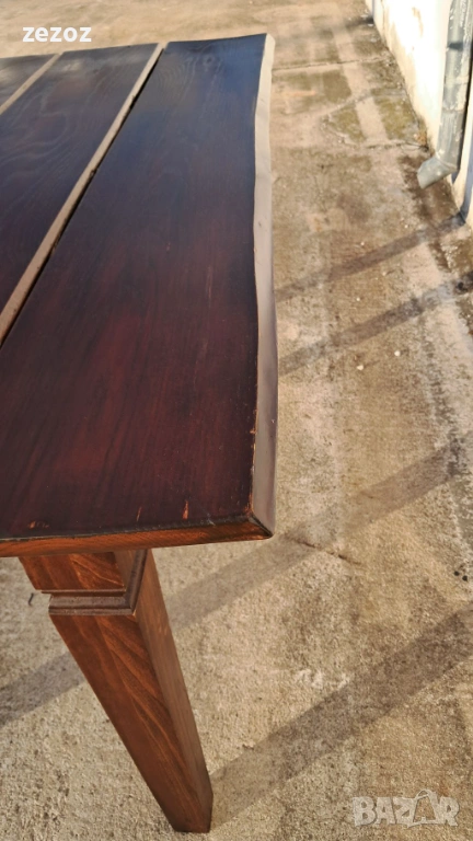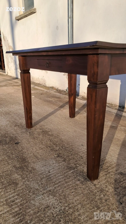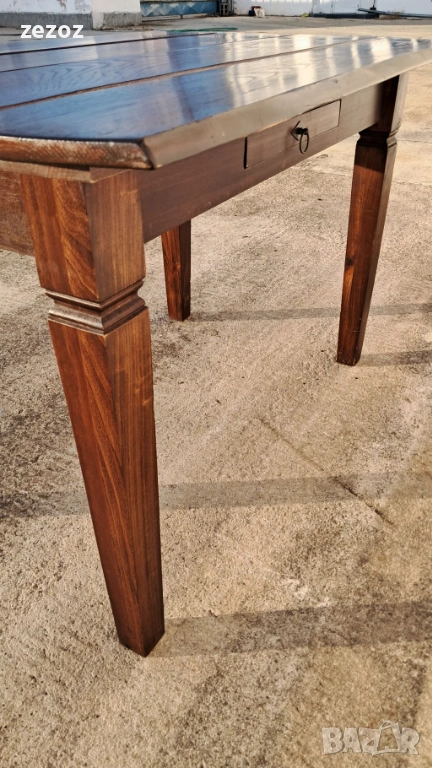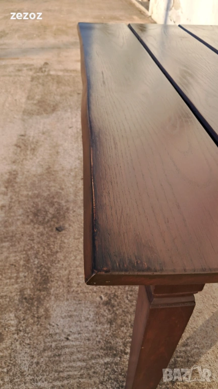 Трапезна маса пълен масив-дъб.Масата е по-различна.Плота най-вероятно е правен допълнително от дебели дъски,като ръбовете на двете дълги страни са обработени вълнообразно,за да създат илюзия за износване.Вижда се на снимките.Също така крайните дъски имат дъга това също е снимано.Краката се свалят.Масата е с две чекмеджета.Поради тези особенности само лично предаване.Размери-