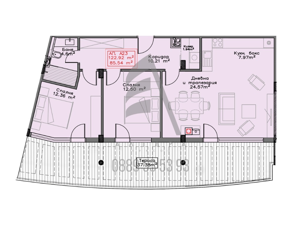 Предлагаме ви тристаен апартамент А23 с обща квадратура 139,10 кв.м, от които 37,38 кв.м просторна тераса с гледка към Витоша, която няма да бъде застроена. Апартаментът е разположен на седми етаж, с изложение запад, състоящ се от входно антре, просторна дневна с кухня и излаз към терасата, две спални, мокро помещение и санитарно помещение.
