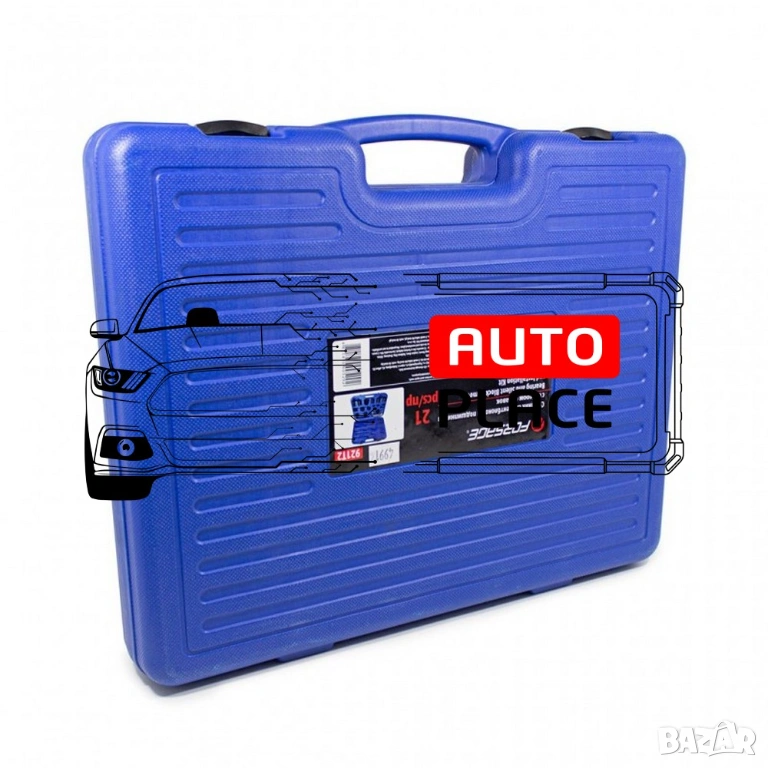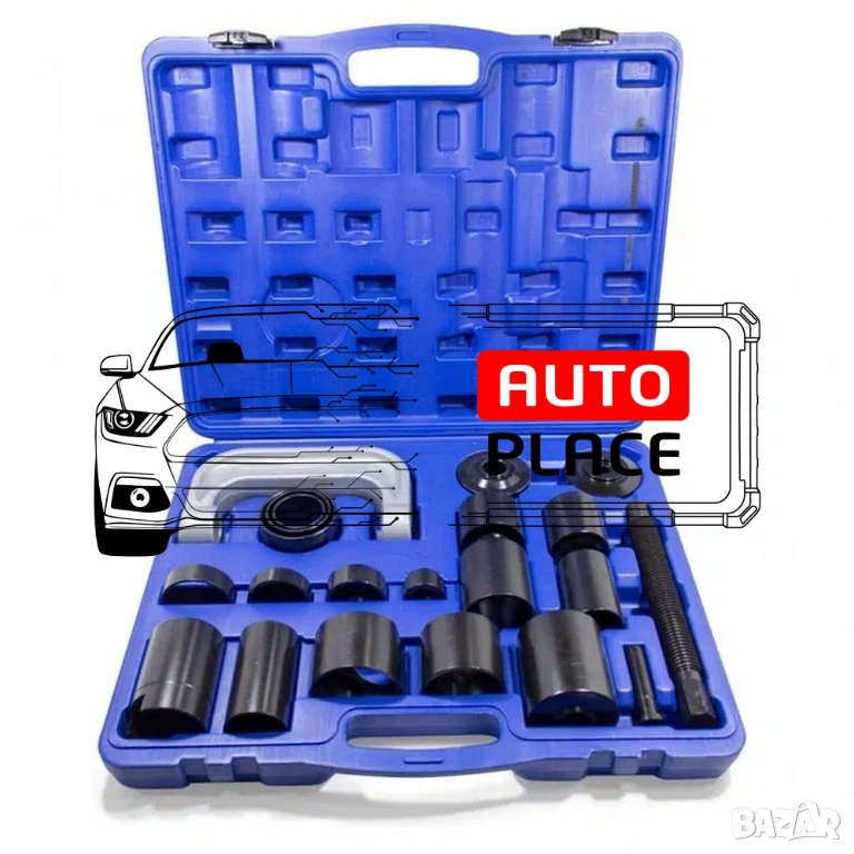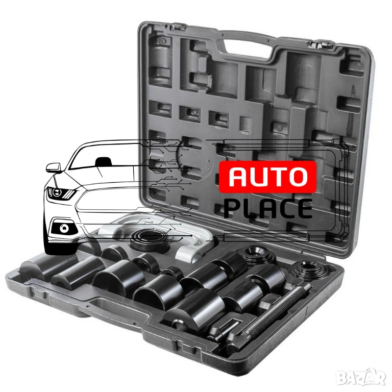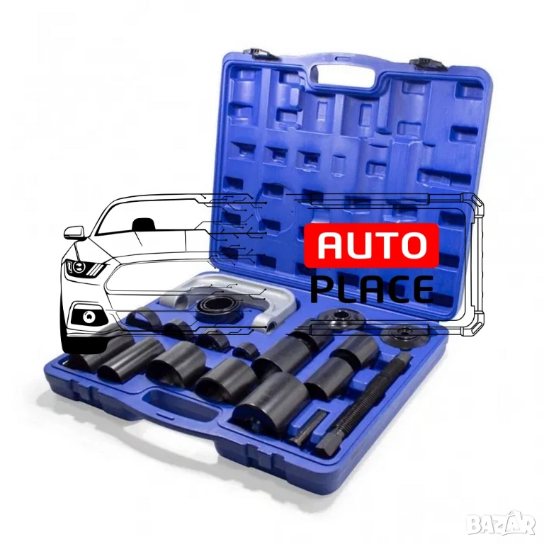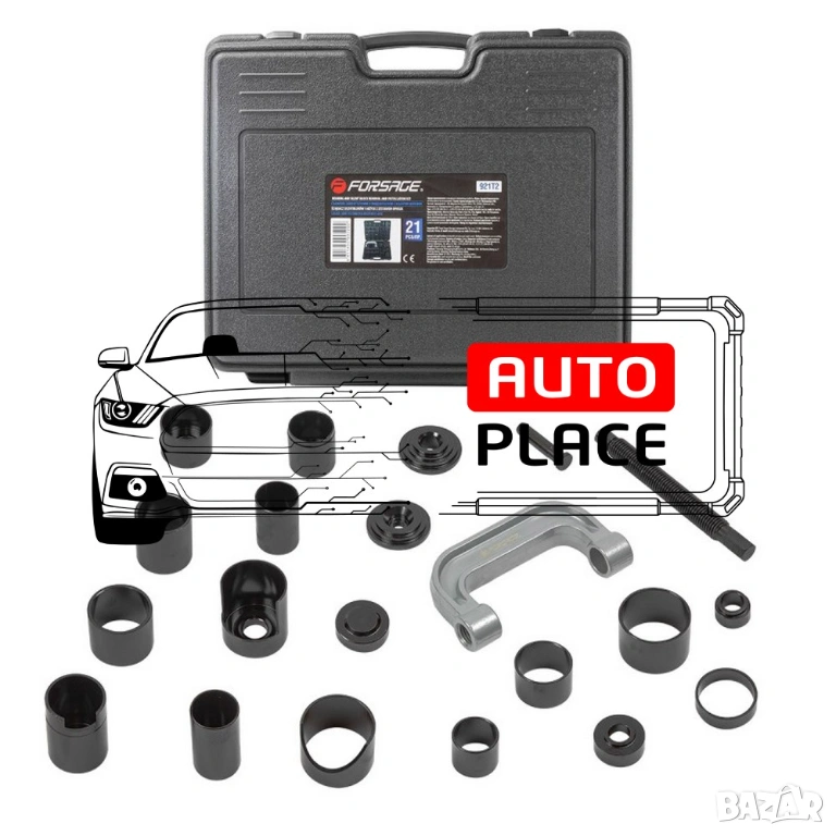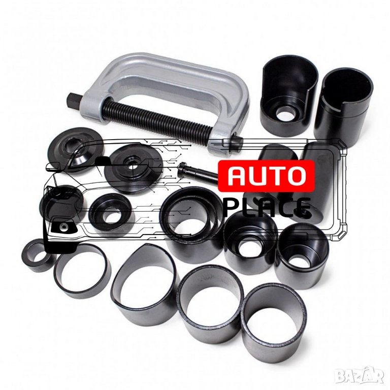 Универсална скоба за лагери, шарнири и тампони 21 части. Комплектът съдържа най-често използваните размери за леки и товарни автомобили. Служи за бързото отстраняване и монтиране на различни детайли. Основно се ползва за шарнирни болтове, тампони и някои модели лагери.