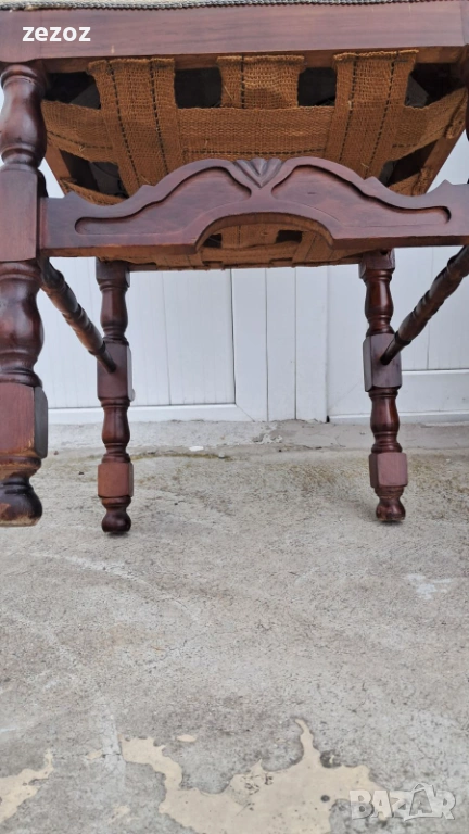 Трапезни ретро столове,изработени от орехов масив.Старата система на седалките-ремъци и пружини.Запазена дамаска.Конструктивно здрави.